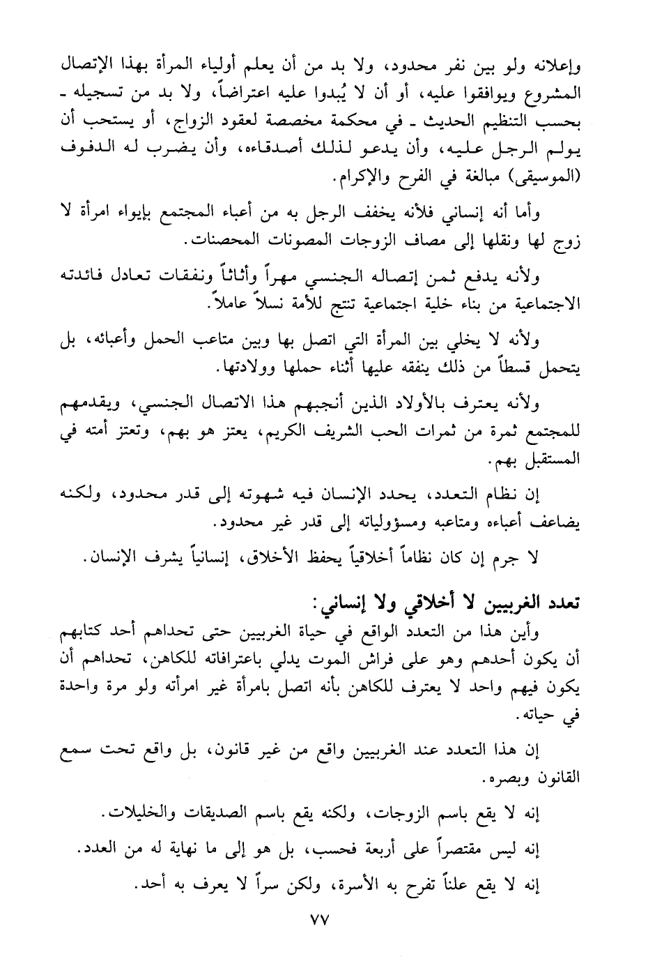 إن نظام التعدد، يحدد الانسان فيه شهوته الى قدر محدود، ولكنه يضاعف أعباءه ومتاعبه ومسؤولياته الى قدر غير محدود.