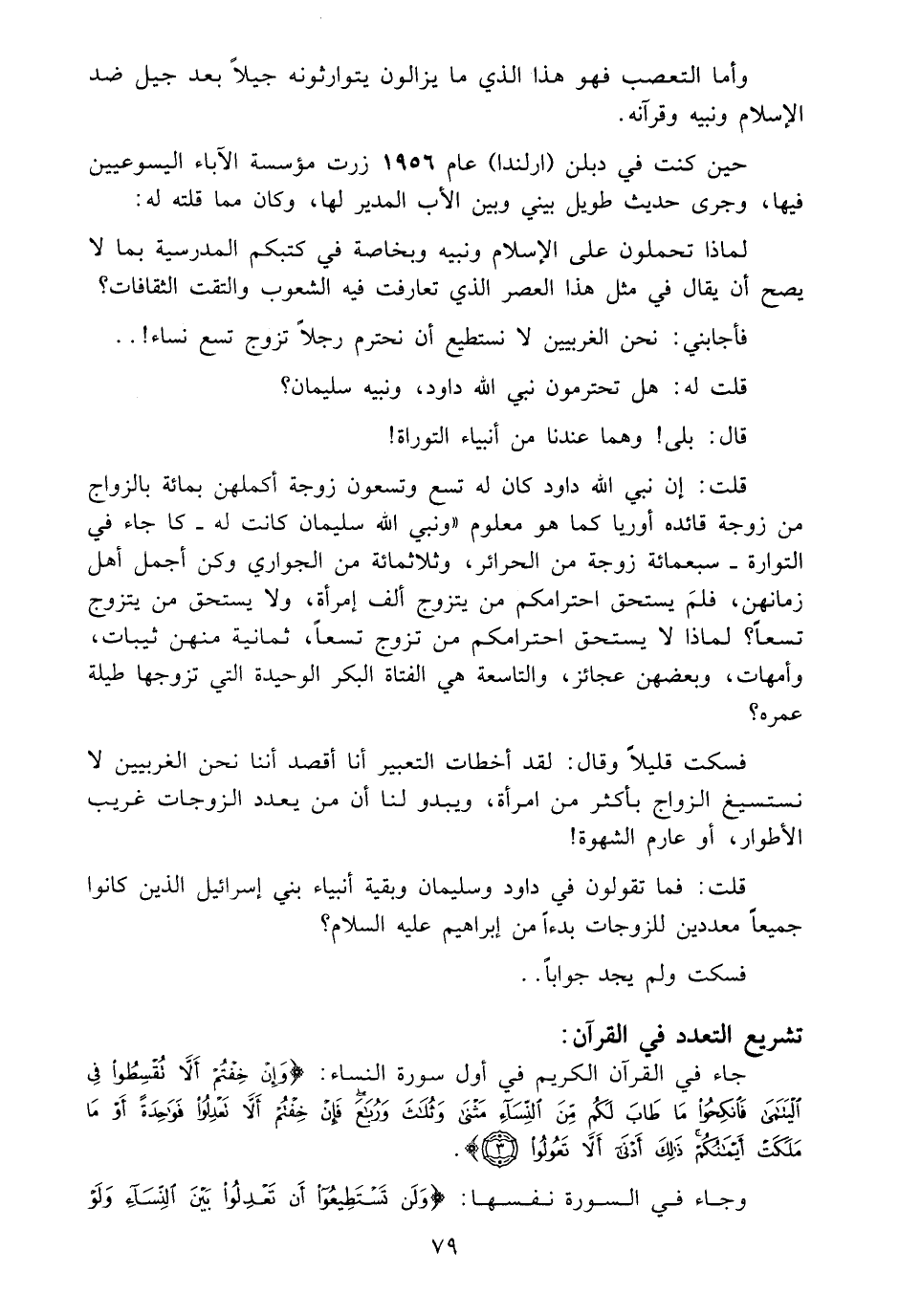 فسكت قليلاً وقال: لقد أخطأت التعبير أنا أقصد أننا نحن الغربيين لا نستسيغ الزواج بأكثر من امرأة، ويبدوا لنا أن من يعدد الزوجات غريب الأطوار، أو عارم الشهوة!