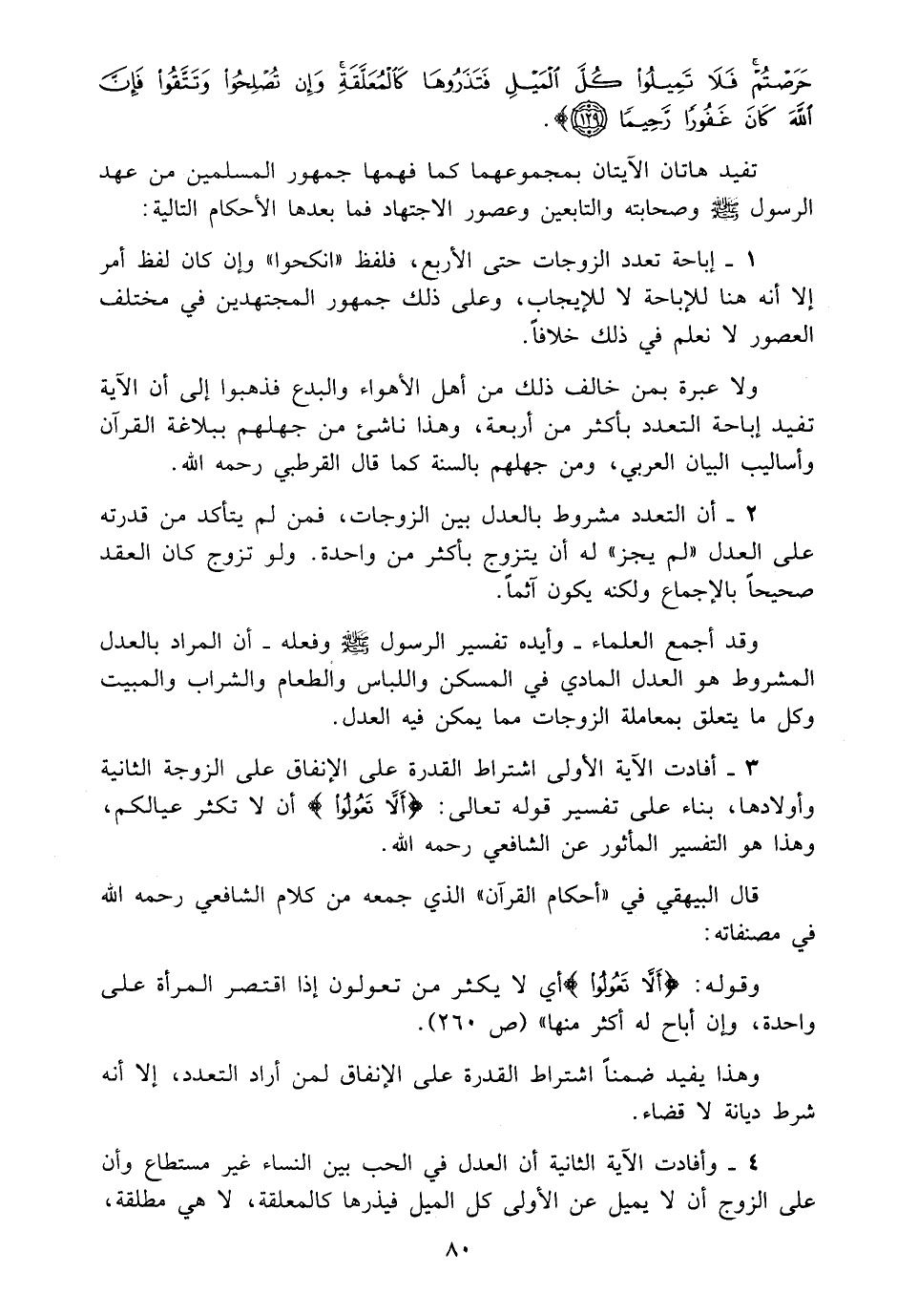 3 - أفادت الآية الأولى اشتراط القدرة على الانفاق على الزوجة الثانية وأولادها، بناء على تفسير قوله تعالى {أن لا تعولوا} أن لا تكثر عيالكم، وهذا هو التفسير المأثور عن الشافعي رحمه الله.