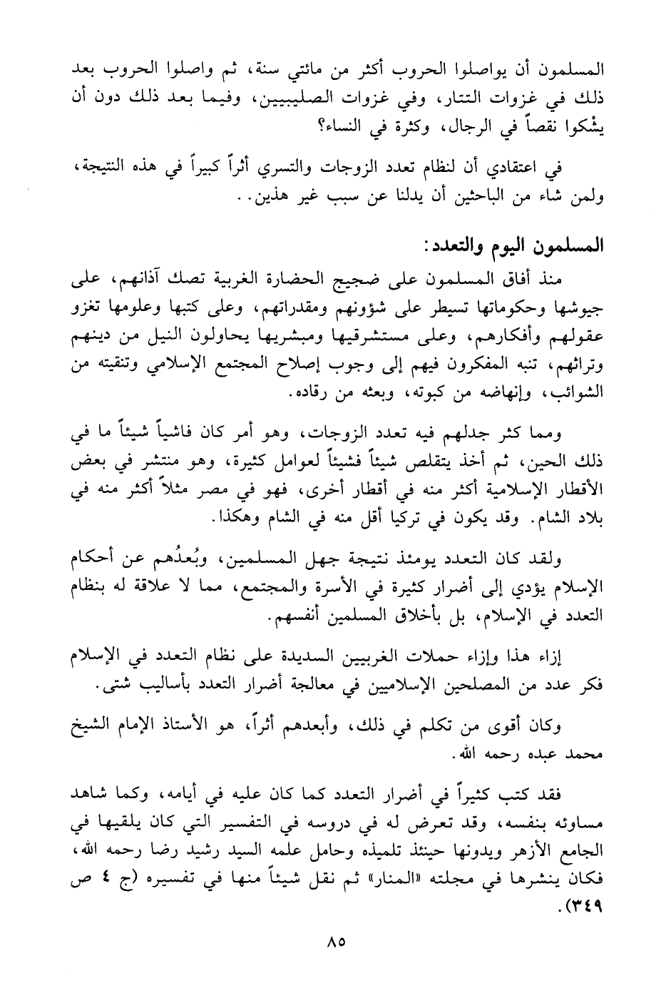 ولقد كان التعدد يومئذ نتيجة جهل المسلمين، وبُعدهم عن أحكام الاسلام يؤدي الى أضرار كثيرة في الأسرة والمجتمع، مما لا علاقة له بنظام التعدد في الاسلام، بل بأخلاق المسلمين أنفسهم.