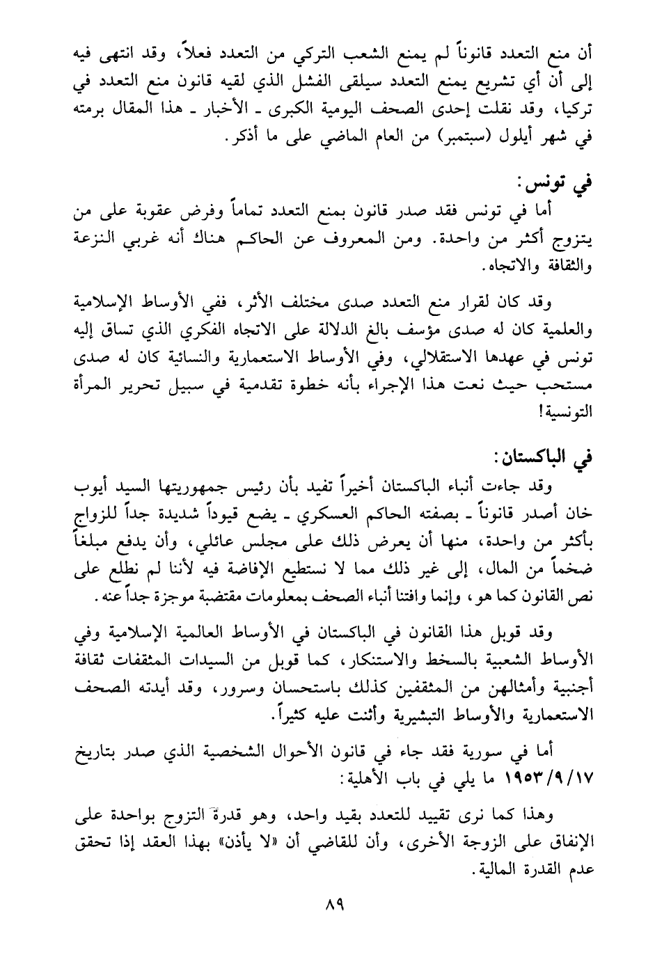 وقد جاءت أنباء الباكستان أخيرا تفيد بأن رئيس جمهوريتها السيد أيوب خان أصدر قانونا - بصفته الحاكم العسكري - يضع قيودا شديدة جدا للزواج بأكثر من واحدة، منها أن يعرض ذلك على مجلس عائلي، وأن يدفع مبلغاً ضخماً من المال، الى غير ذلك مما لا نستطيع الافاضة فيه لأننا لم نطلع على نص القانون كما هو، وإنما وافتنا أنباء الصحف بمعلومات مقتضبة موجزة جداً عنه.