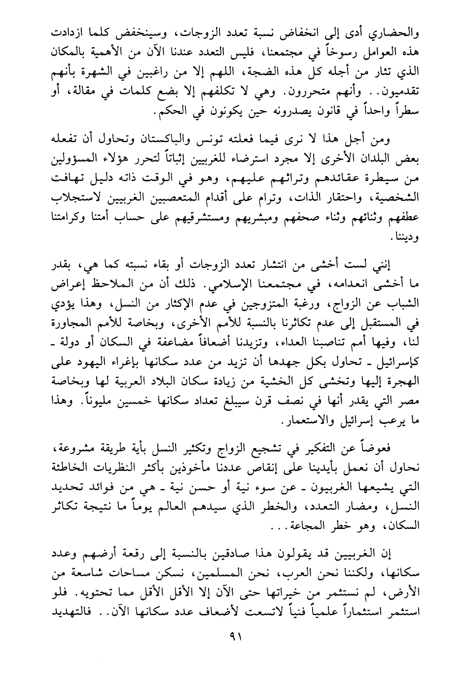 إنني لست أخشى من انتشار تعدد الزوجات أو بقاء نسبته كما هي، بقدر ما أخشى انعدامه في مجتمعنا الاسلامي. ذلك أن من الملاحظ اعراض الشباب عن الزواج، ورغبة المتزوجين في عدم الاكثار من النسل، وهذا يؤدي في المستقبل الى عدم تكاثرنا بالنسبة للأمم الأخرى، وبخاصة للأمم المجاورة لنا، وفيها أمم تناصينا العداء، وتزيدنا اضعافا مضاعفة في السكان أو دولة - كاسرائيل - تحاول بكل جهدها أن تزيد من عدد سكانها بإغراء اليهود على الهجرة اليها وتخشى كل الخشية من زيادة سكان البلاد العربية لها وبخاصة مصر التي يقدر أنها في نصف قرن سيبلغ تعداد سكانها خمسين مليونا. وهذا ما يرعب اسرائيل والاستعمار.
