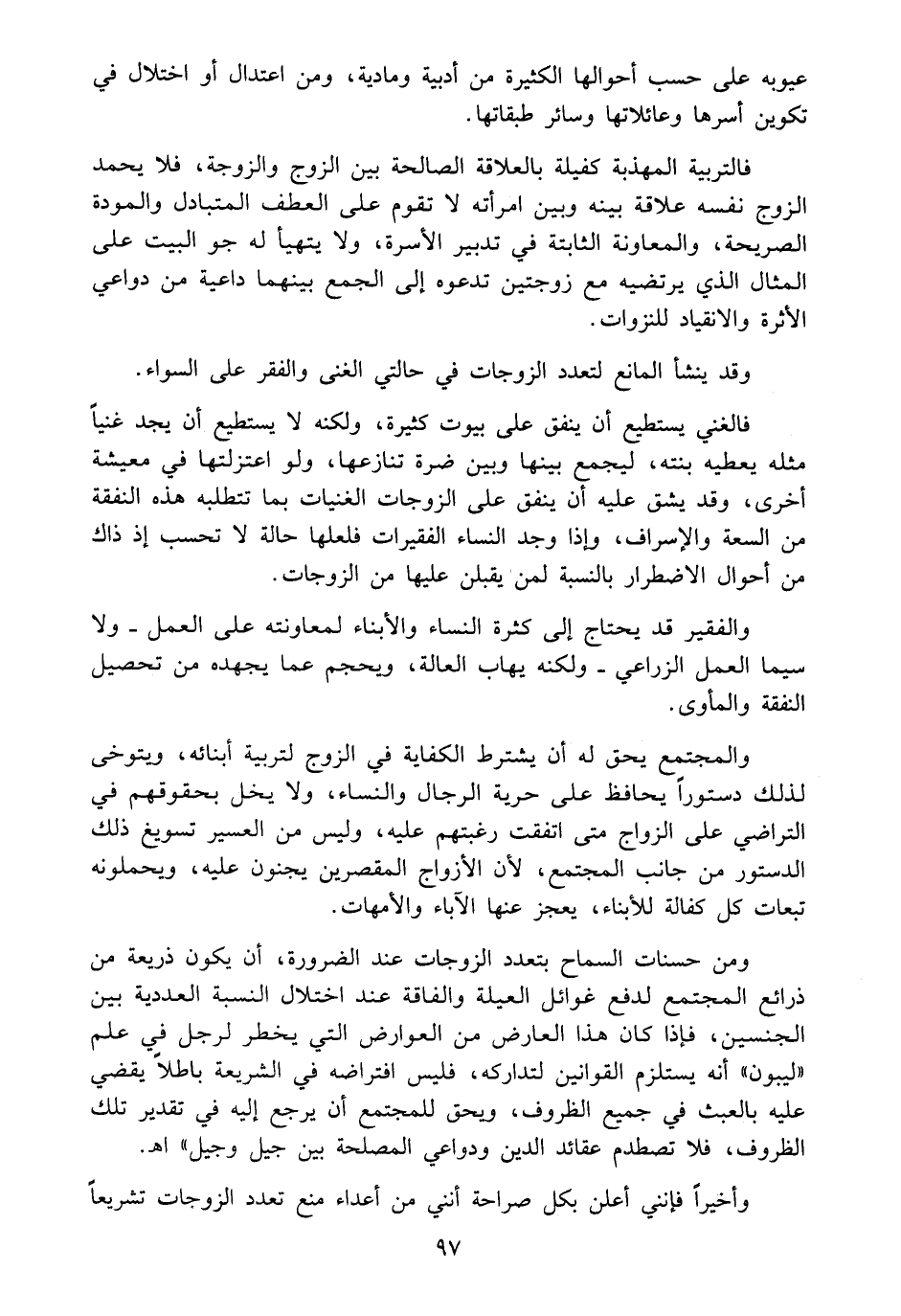 وأخيراً فإنني أعلن بكل صراحة أنني من أعداء منع تعدد الزوجات تشريعاً