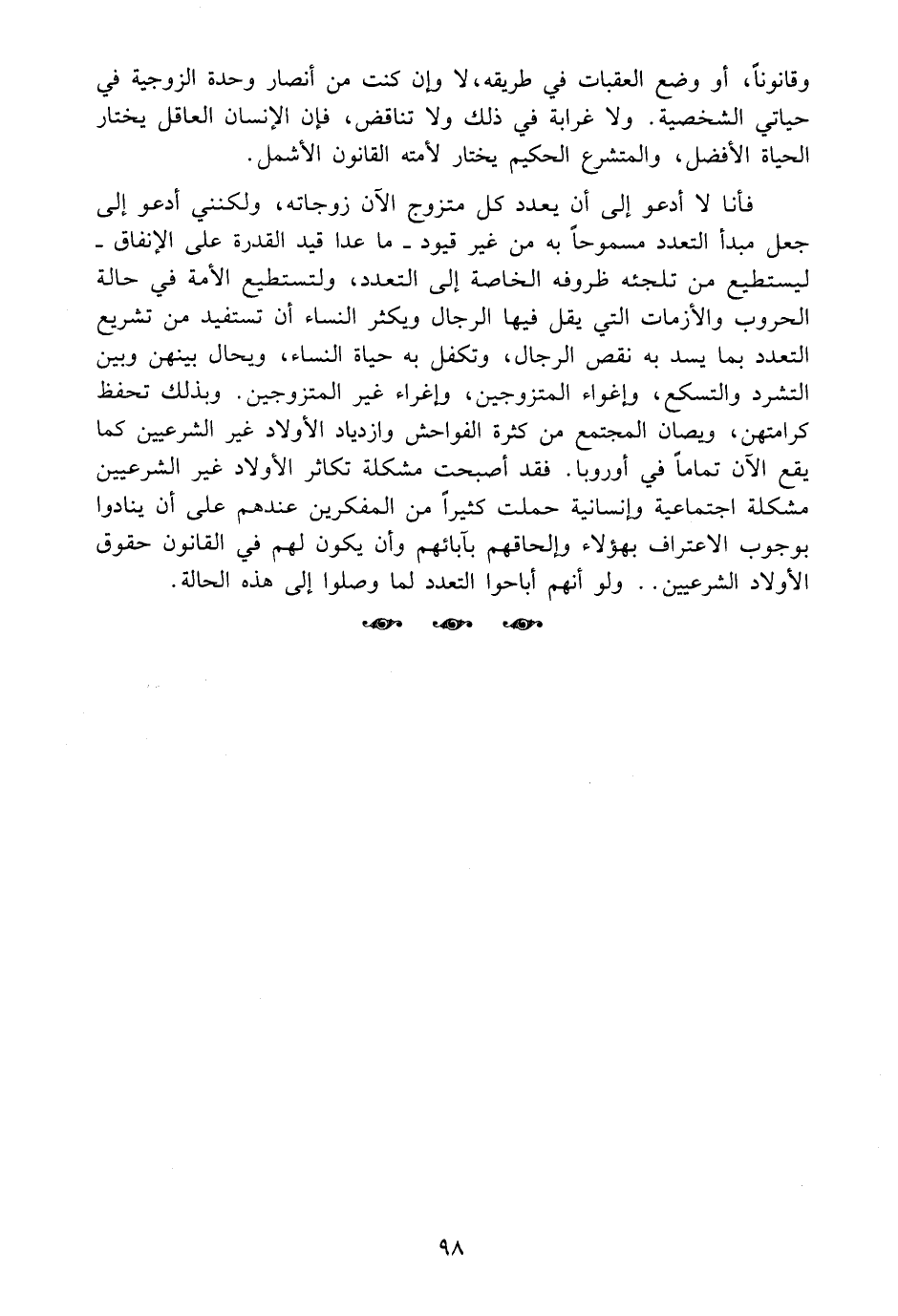 فأنا لا أدعو الى أن يعدد كل متزوج الآن زوجاته، ولكنني أدعو جعل مبدأ التعدد مسموحاً به من غير قيود - ما عدا قيود القدرة على الانفاق - ليستطيع من تلجؤه ظروفه الخاصة الى التعدد، ولتستطيع الأمة في حالة الحروب والأزمات التي يقل فيها الرجال ويكثر النساء أن تستفيد من تشريع التعدد بما يسد به نقص الرجال، وتكفل به حياة النساء، ويحال بينهن وبين التشرد والتسكع، وإغواء المتزوجين، وإغراء غير المتزوجين. وبذلك تحفظ كرامتهن، ويصان المجتمع من كثرة الفواحش وازدياد الأولاد غير الشرعيين كما يقع الآن تماماً في أوروبا. فقد أصبحت مشكلة تكاثر الأولاد غير الشرعيين مشكلة اجتماعية وإنسانية حملت كثيراً من المفكرين عندهم على أن ينادوا بوجوب الاعتراف بهؤلاء وإلحاقهم بآبائهم وأن يكون لهم في القانون حقوق الأولاد الشرعيين .. ولو أنهم أباحوا التعدد لما وصلوا الى هذه الحالة.