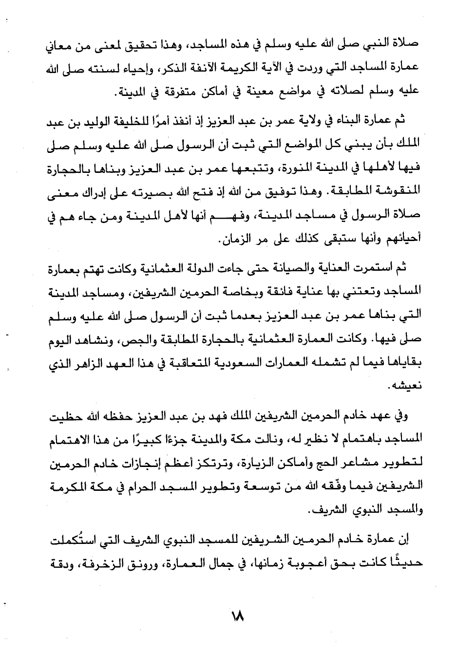 18…صلاة النبي صلى الله عليه وسلم في هذه المساجد، وهذا تحقيق لمعنى من معاني عمارة المساجد التي وردت في الآية الكريمة الآنفة الذكر، وإحياء لسنته صلى الله عليه وسلم لصلاته في مواضع معينة في أماكن متفرقة في المدينة. ثم عمارة البناء في ولاية عمر بن عبد العزيز إذ أنفذ أمرًا للخليفة الوليد بن عبد الملك بأن يبني كل المواضع التي ثبت أن الرسول صلى الله عليه وسلم صلى فيها لأهلها في المدينة المنورة، وتتبعها عمر بن عبد العزيز وبناها بالحجارة المنقوشة المطابقة، وهذا توفيق من الله إذ فتح الله بصيرته على إدراك معنى صلاة الرسول في مساجد المدينة، وفهم أنها لأهل المدينة ومن جاءهم في أحيائهم وأنها ستبقى كذلك على مر الزمان. ثم استمرت العناية والصيانة حتى جاءت الدولة العثمانية وكانت تهتم بعمارة المساجد وتعتني بها عناية فائقة وبخاصة الحرمين الشريفين، ومساجد المدينة التي بناها عمر بن عبد العزيز بعدما ثبت أن الرسول صلى الله عليه وسلم صلى فيها. وكانت العمارة العثمانية بالحجارة المطابقة والجص، ونشاهد اليوم بقاياها فيما لم تشمله العمارات السعودية المتعاقبة في هذا العهد الزاهر الذي نعيشه. وفي عهد خادم الحرمين الشريفين الملك فهد بن عبد العزيز حفظه الله حظيت المساجد باهتمام لا نظير له، ونالت مكة والمدينة جزاءًا كبيرًا من هذا الاهتمام لتطوير مشاعر الحج وأماكن الزيارة، وترتكز أعظم إنجازات خادم الحرمين الشريفين فيما وفّقه الله من توسعة وتطوير المسجد الحرام في مكة المكرمة والمسجد النبوي الشريف. إن عمارة خادم الحرمين الشريفين للمسجد النبوي الشريف التي استُكملت حديثًا كانت بحق أعجوبة زمانها، في جمال العمارة، ورونق الزخرفة، ودقة…