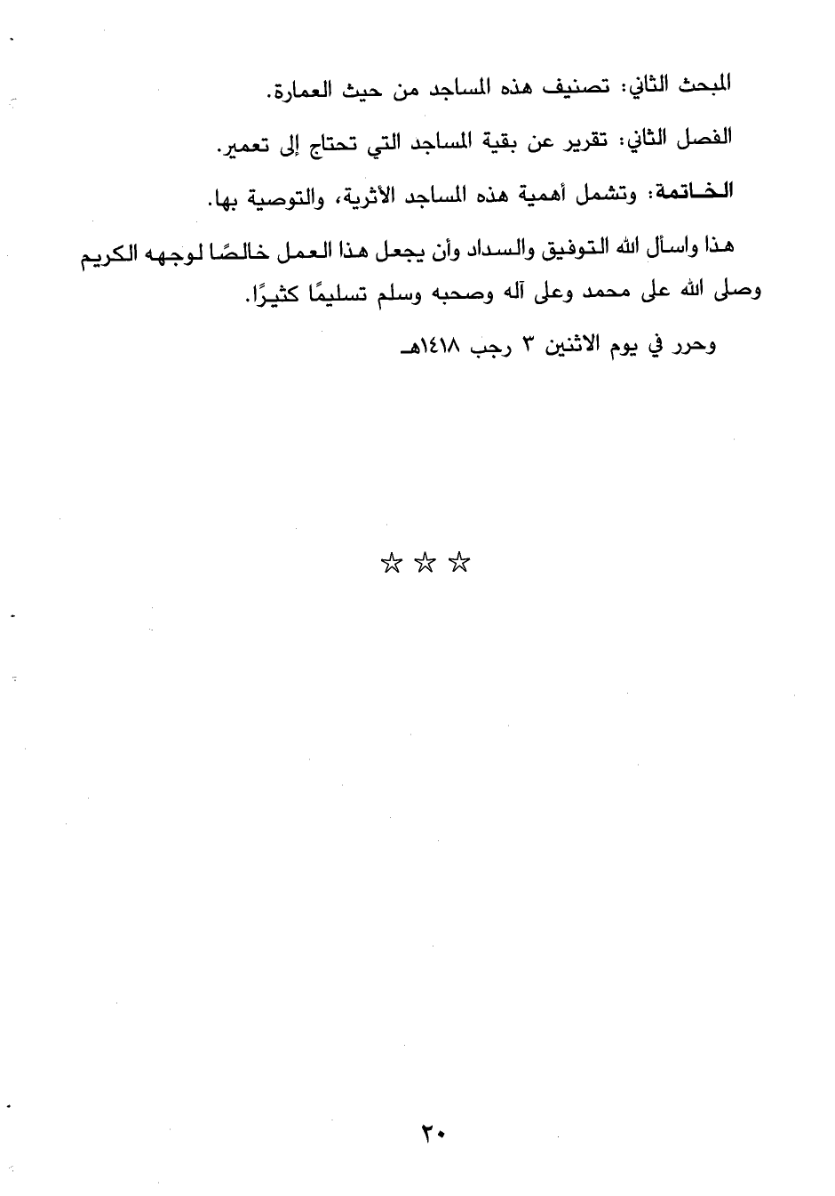 المبحث الثاني: تصنيف هذه المساجد من حيث العمارة. الفصل الثاني: تقرير عن بقية المساجد التي تحتاج إلى تعمير. الخاتمة: وتشمل أهمية هذه المساجد الأثرية، والتوصية بها. هذا وأسأل الله التوفيق والسداد وأن يجعل هذا العمل خالصًا لوجهه الكريم وصلى الله على محمد وعلى آله وصحبه وسلم تسليمًا كثيرًا.