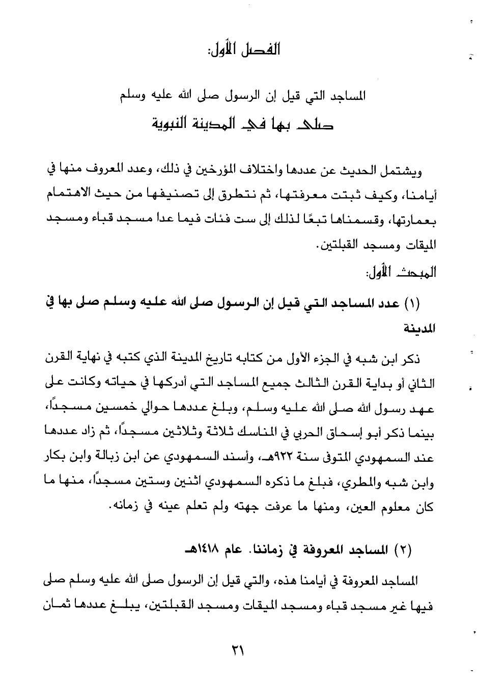 الفصل الأول: المساجد التي قيل إن الرسول صلى الله عليه وسلم صلى بها في المدينة النبوية