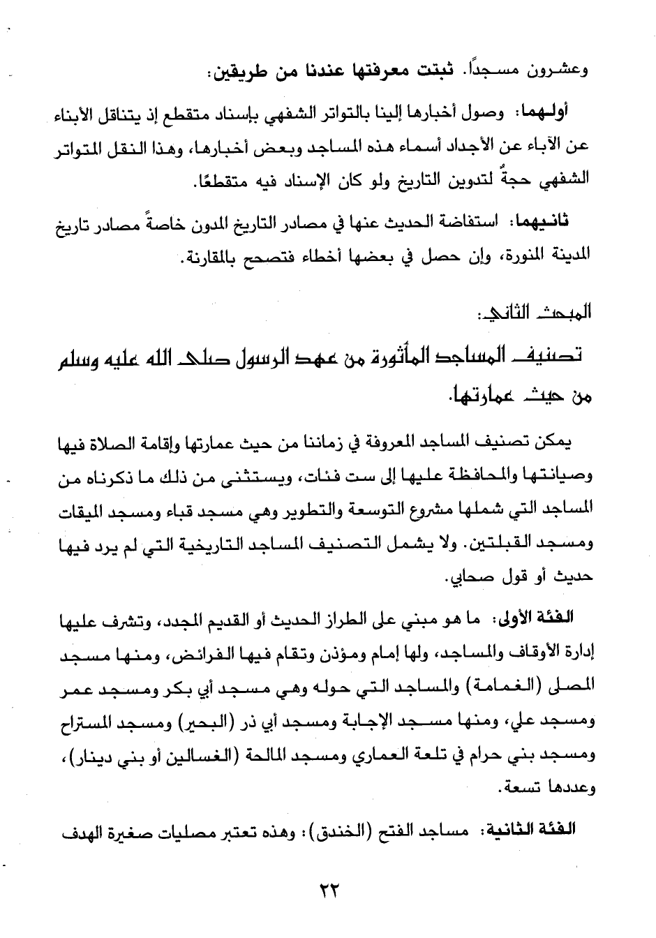 22…وعشرون مسجدًا. ثبتت معرفتها عندنا من طريقين: أولهما: وصول أخبارها إلينا بالتواتر الشفهي بإسناد متقطع إذ يتناقل الأبناء عن الآباء عن الأجداد أسماء هذه المساجد وبعض أخبارها، وهذا النقل المتواتر الشفهي حجةٌ لتدوين التاريخ ولو كان الإسناد فيه متقطعًا. ثانيهما:: استفاضة الحديث عنها في مصادر التاريخ المدون خاصةً مصادر تاريخ المدينة المنورة، وإن حصل في بعضها أخطاء فتصحح بالمقارنة.