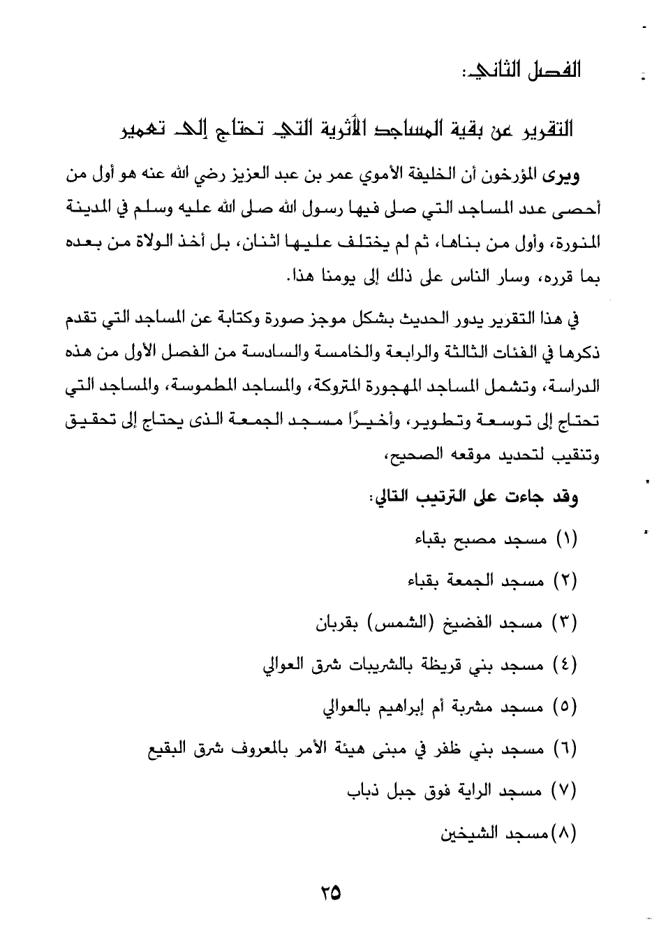 ويرى بعض المؤرخون أن الخليفة الأموي عمر بن عبد العزيز رضي الله عنه هو أول من أحصى عدد المساجد التي صلى فيها رسول الله صلى الله عليه وسلم في المدينة المنورة، وأول من بناها، ثم لم يختلف عليها اثنان، بل أخذ الولاة من بعده بما قرره، وسار الناس على ذلك إلى يومنا هذا. في هذا التقرير يدور الحديث بشكل موجز وصورة وكتابة عن المساجد التي تقدم ذكرها في الفئات الثالثة والرابعة والخامسة والسادسة من الفصل الأول من هذه الدراسة، وتشمل المساجد المهجورة المتروكة، والمساجد المطموسة، والمساجد التي تحتاج إلى توسعة وتطوير، وأخيرًا مسجد الجمعة الذي يحتاج إلى تحقيق وتنقيب لتحديد موقعه الصحيح، وقد جاءت على الترتيب التالي:
