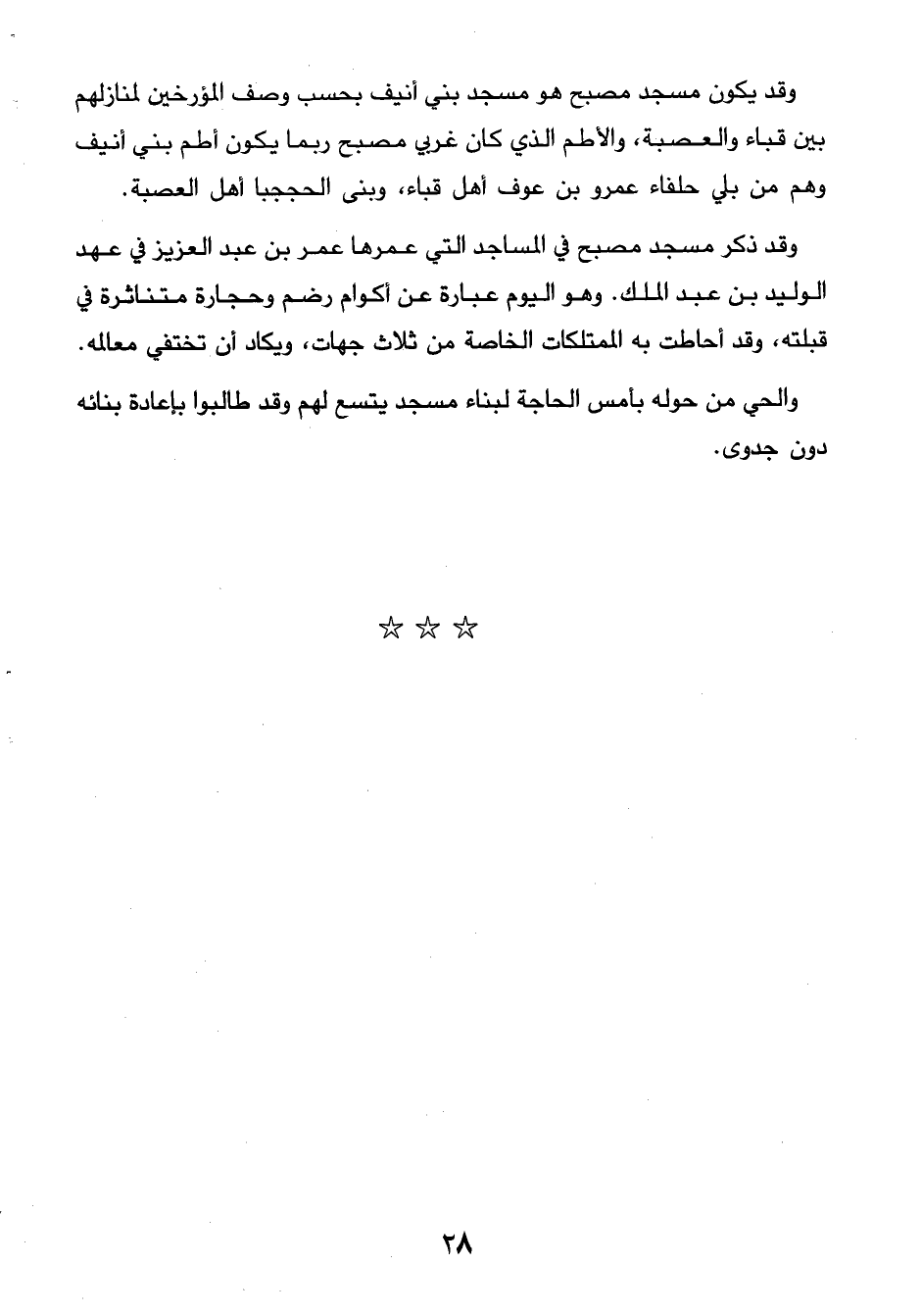 28…وقد يكون مسجد مصبح هو مسجد بني أنيف بحسب وصف المؤرخين لمنازلهم بين قباء والعصبة، والأطم الذي كان غربي مصبح ربما يكون أطم بني أنيف وهم من بلي حلفاء عمرو بن عوف أهل قباء، وبنى الحججبا أهل العصبة. وقد ذكر مسجد مصبح في المساجد التي عمرها عمر بن عبد العزيز في عهد الوليد بن عبد الملك. وهو اليوم عبارة عن أكوام رضم وحجارة متناثرة في قبلته، وقد احاطت به الممتلكات الخاصة من ثلاث جهات، ويكاد أن تختفي معالمه. والحي من حوله بأمس الحاجة لبناء مسجد يتسع لهم وقد طالبوا بإعادة بناءه دون جدوى.…