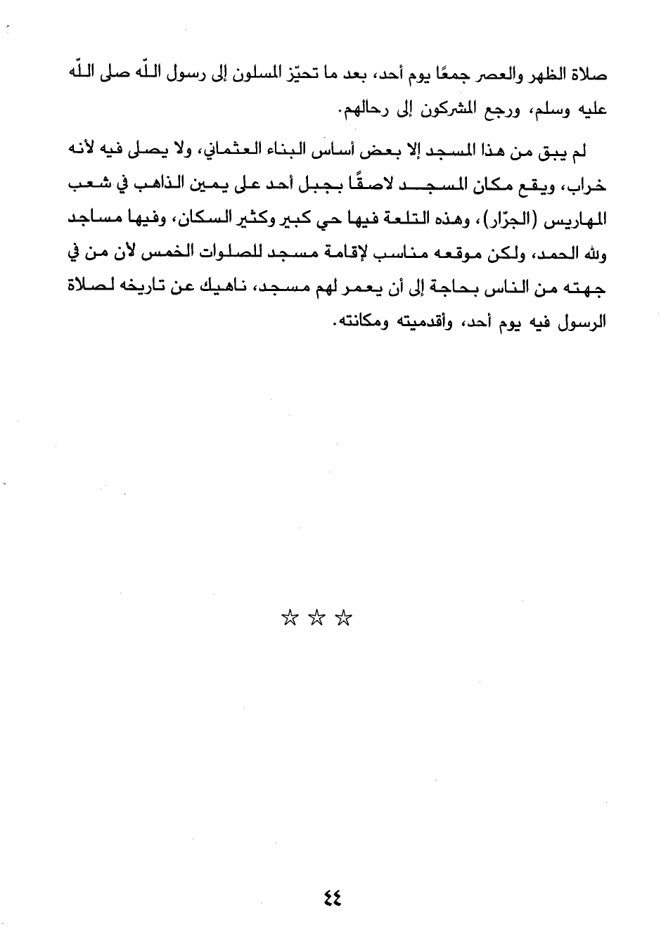 44…صلاة الظهر والعصر جمعًا يوم احد، بعد ما تحيّز المسلون إلى رسول الله صلى الله عليه وسلم، ورجع المشركون إلى رحالهم. لم يبق من ذها المسجد إلا بعض أساس البناء العثماني، ولا يصلى فيه لأنه خراب، ويقع مكان المسجد لاصقًا بجبل أحد على يمين الذاهب في شعب المهاريس (الجرًار)، وهذه التلعة فيها حي كبير وكثير السكان، وفيها مساجد ولله الحمد، ولكن موقعه مناسب للصلوات الخمس لأن من في جهته من الناس بحاجة إلى أن يعمر لهم مسجد، ناهيك عن تاريخه لصلاة الرسول فيه يوم أحد، وأقدميته ومكانته.…