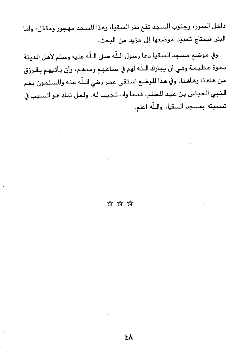 48…داخل السور، وجنوب المسجد تقع بئر السقيا، وهذا المسجد مهجور ومقفل، وأما البئر فيحتاج تحديد موضعها إلى مزيد من البحث. وفي موضع مسجد السقيا دعا رسول الله صلى الله عليه وسلم لأهل المدينة دعوة عظيمة وهي أن يبارك الله لهم في صاعهم ومدهم، وأن يأتيهم بالرزق من هاهنا وهاهنا. وفي هذا الموضع استقى عمر رضي الله عنه والمسلمون بعم النبي العباس بن عبد المطلب فدعا واستجيب له. ولعل ذلك هو السبب في تسميته بمسجد السقيا، والله أعلم.…