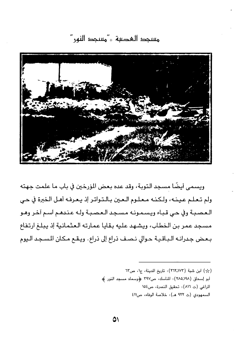 (*) ابن شبه (173 - 262): تاريخ المدينة المنورة، ج1، ص 63 أبو إسحاق الأيوبي: المناسك، ص 397 (وسماه مسجد النور) المراغي (ت 816) تحقيق النصرة، ص 154 السمهودي (ت 922 هـ: خلاصة الوفاء، ص 411