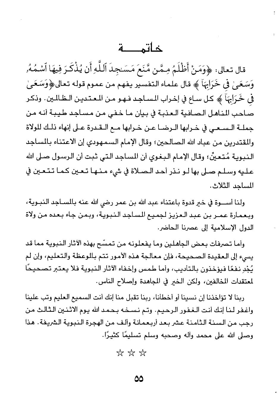 وأما تصرفات بعض الجاهلين وما يفعلونه من تمسّح بهذه الآثار النبوية مما قد يسيء إلى العقيدة الصحيحة، فإن معالجة هذه الأمور تتم بالموعظة والتعليم، وإن لم يُجْدِ نفعًا فيؤخذون بالتأديب، وأما طمس وإخفاء الآثار النبوية فلا يعتبر تصحيحًا لمعتقدات المخالفين، ولكن الخير في المجاهدة وإصلاح الناس. ربنا لا تؤاخذنا إن نسينا أو أخطأنا، ربنا تقبل منا إنك أنت السميع العليم وتب علينا واغفر لنا إنك أنت الغفور الرحيم. وتم نسخه بحمد الله يوم الاثنين الثالث من رجب من السنة الثامنة عشر بعد أربعمائة وألف من الهجرة النبوية الشريفة. هذا وصلى الله على محمد وآله وصحبه وسلم تسليمًا كثيرًا.…