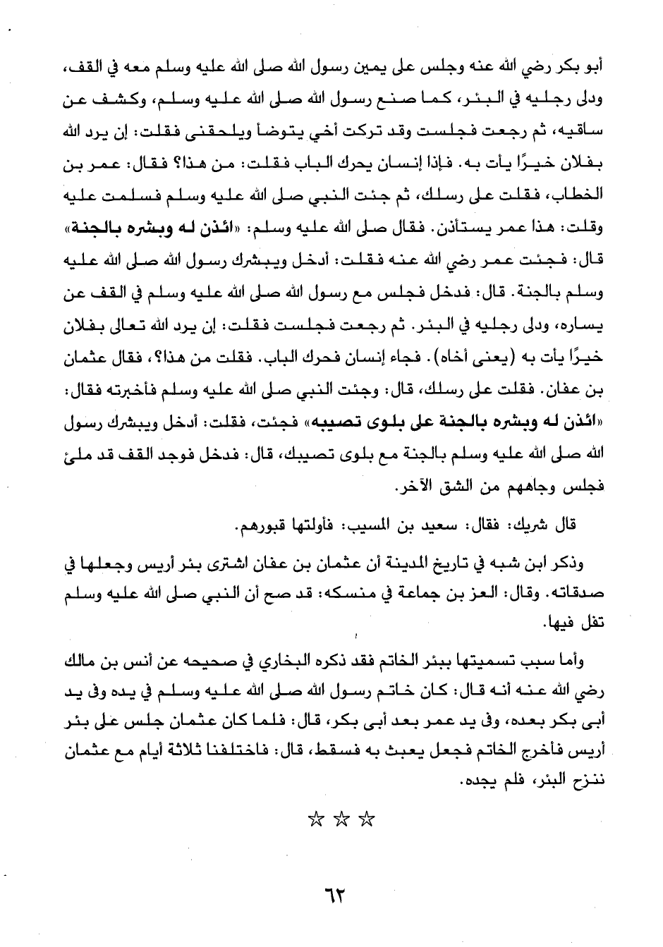 62…أبو بكر رضي الله عنه وجلس على يمين رسول الله صلى الله عليه وسلم معه في القف، ودلى رجليه في البئر، كما صنع رسول الله صلى الله عليه وسلم، وكشف عن ساقيه، ثم رجعت فجلست وقد تركت أخي يتوضأ ويلحقنى فقلت: إن يرد الله بفلان خيرًا يأت به، فإذا إنسان يحرك الباب فقلت: من هذا؟ فقال: عمر بن الخطاب، فقلت على رسلك، ثم جئت النبي صلى الله عليه وسلم فسلمت عليه وقلت: هذا عمر يستأذن، فقال صلى الله عليه وسلم: ((ائذن له وبشره بالجنة) قال: فجئت عمر رضي الله عنه فقلت: أدخل ويبشرك رسول الله صلى الله عليه وسلم بالجنة. قال: فدخل فجلس مع رسول الله صلى الله عليه وسلم في القف عن يساره، ودلى رجليه في البئر، ثم رجعت فجلست فقلت: إن يرد الله بفلان خيرًا يأت به (يعنى أخاه). فجاء إنسان فحرك الباب. فقلت من ذها؟ فقال عثمان بن عفان. فقلت على رسلك. قال: وجئت النبي صلى الله عليه وسلم فأخبرته فقال: ((ائذن له وبشره بالجنة عن بلوى تصيبه)) فجئت، فقلت: أدخل ويبشرك رسول الله صلى الله عليه وسلم بالجنة مع بلوى تصيبك، قال: فدخل فوجد القف قد ملئ فجلس وجاههم من الشق الآخر.