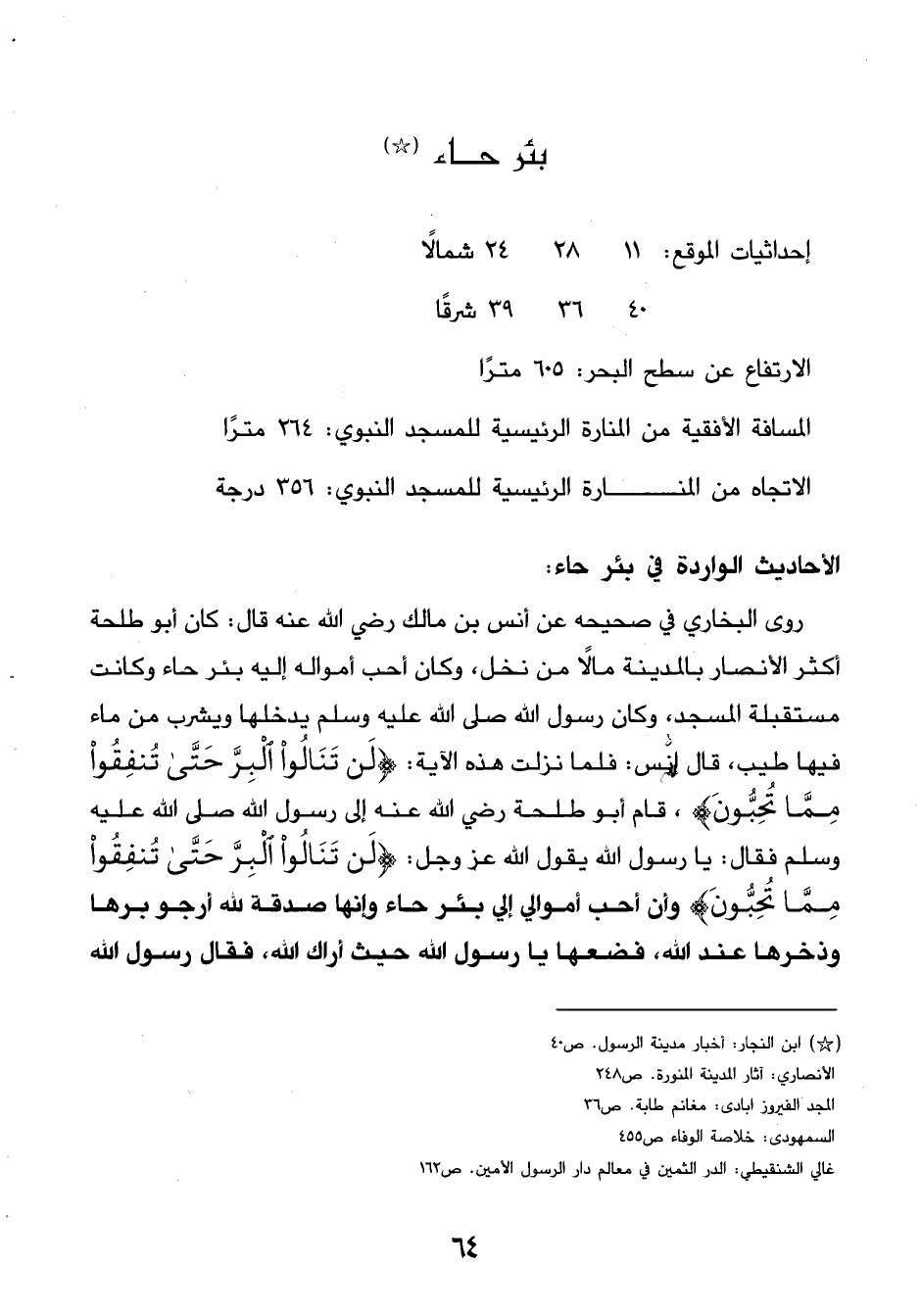 روى البخاري في صحيحه عن أنس بن مالك رضي الله عنه قال: كان ابو طلحة أكثر الأنصار بالمدينة ماًلا من نخل، وكان احب أمواله إليه بئر حار وكانت مستقبلة المسجد، وكان رسول الله صلى الله عليه وسلم يدخلها ويشرب من ماء فيها طيب، قال إنس: فلما نزلت هذه الاية: (لَن تَنَالُواْ الْبِرَّ حَتَّى تُنفِقُواْ مِمَّا تُحِبُّونَ)، قام أبو طلحة رضي الله عنه إلى رسول الله صلى الله عليه وسلم فقال: يا رسول الله يقول الله عز وجل: (لَن تَنَالُواْ الْبِرَّ حَتَّى تُنفِقُواْ مِمَّا تُحِبُّونَ) وأن أحب أموالي إلي بئر حار وإنها صدقة لله أرجو برها وذخرها عند الله، فضعها يا رسول الله حيث أراك الله، فقال رسول الله الاتجاه من المنارة الرئيسية للمسجد النبوي: 356 درجة…