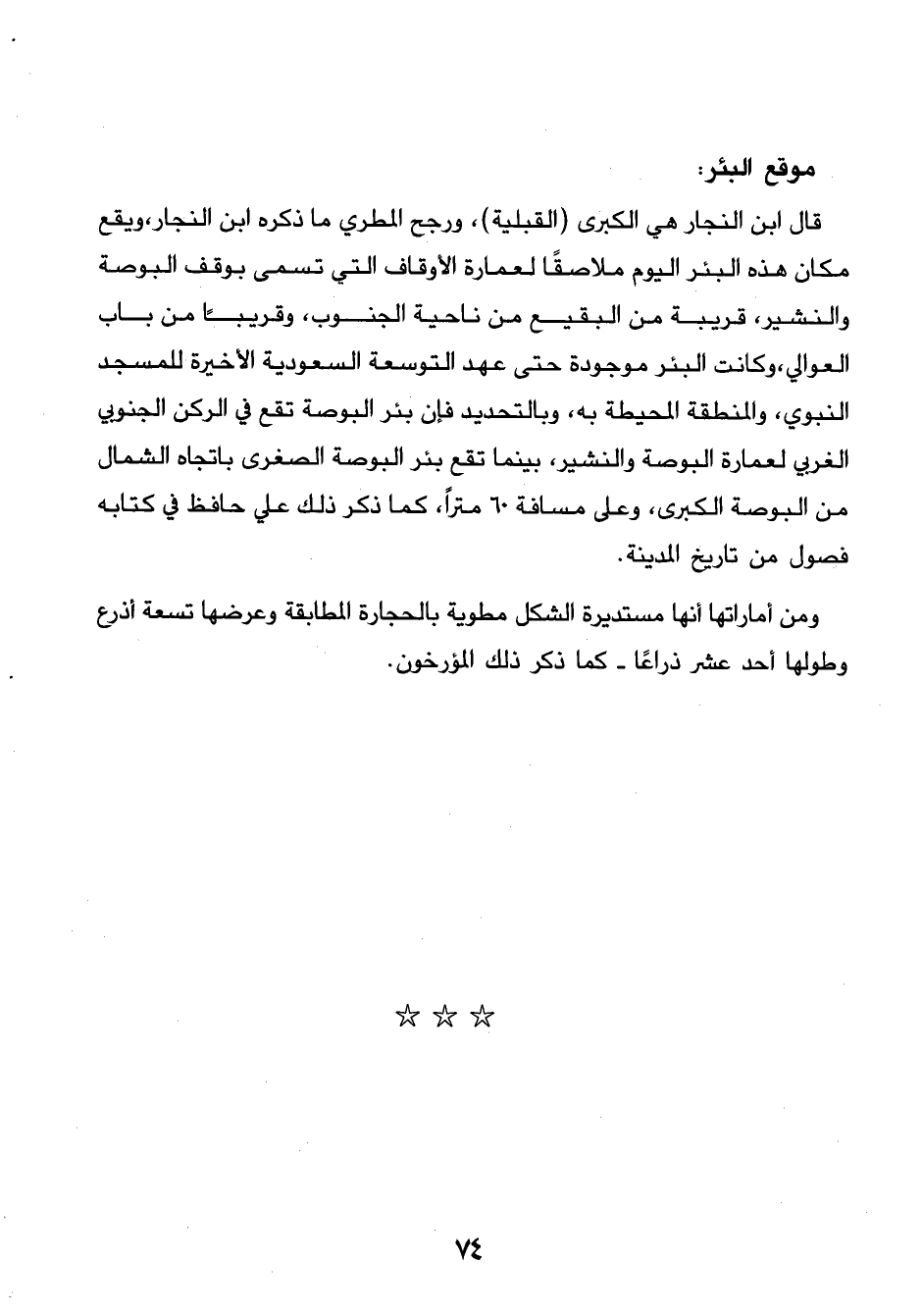 ومن اماراتها أنها مستديرة الشكل مطوية بالحجارة المطابقة وعرضها تسعة أذرع وطولها أحد عشر ذراعًا - كما ذكر ذلك المؤرخون.…