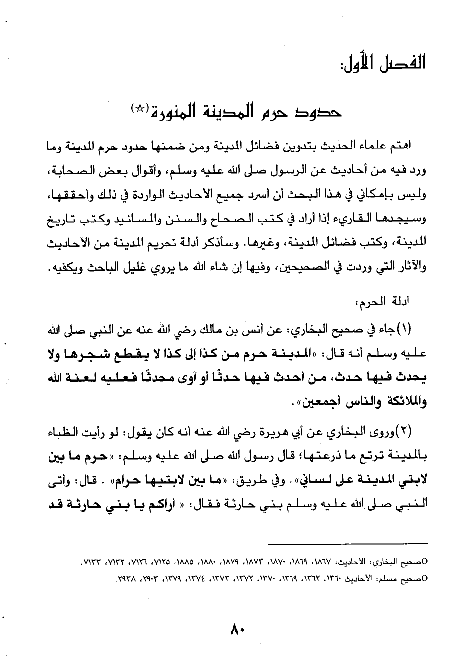 (1) جاء في صحيح البخاري: عن أنس بن مالك رضي الله عنه عن النبي صلى الله عليه وسلم أنه قال: ((المدينة حرم من كذا إلى كذا لا يقطع شجرها ولا يحدث فيها حدث، من أحدث فيها أو آوى محدثًا فعليه لعنة الله والملائكة والناس أجمعين)).