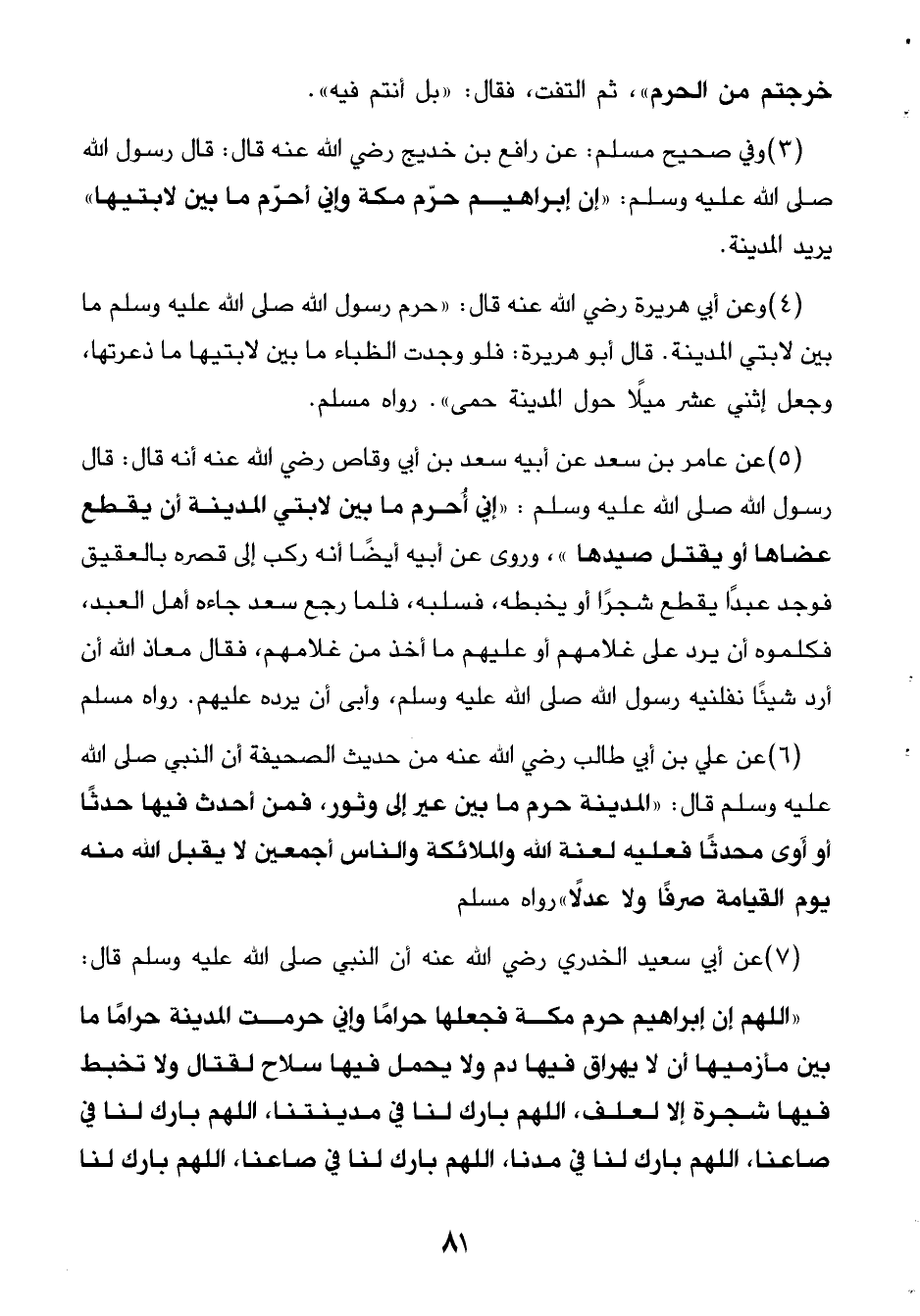 (3) وفي صحيح مسلم: عن رافع بن خديج رضي الله عنه قال: قال رسول الله صلى الله عليه وسل: ((إن إبراهيم حرّم مكة وإني أحرّم ما بين لابتيها)) يريد المدينة.