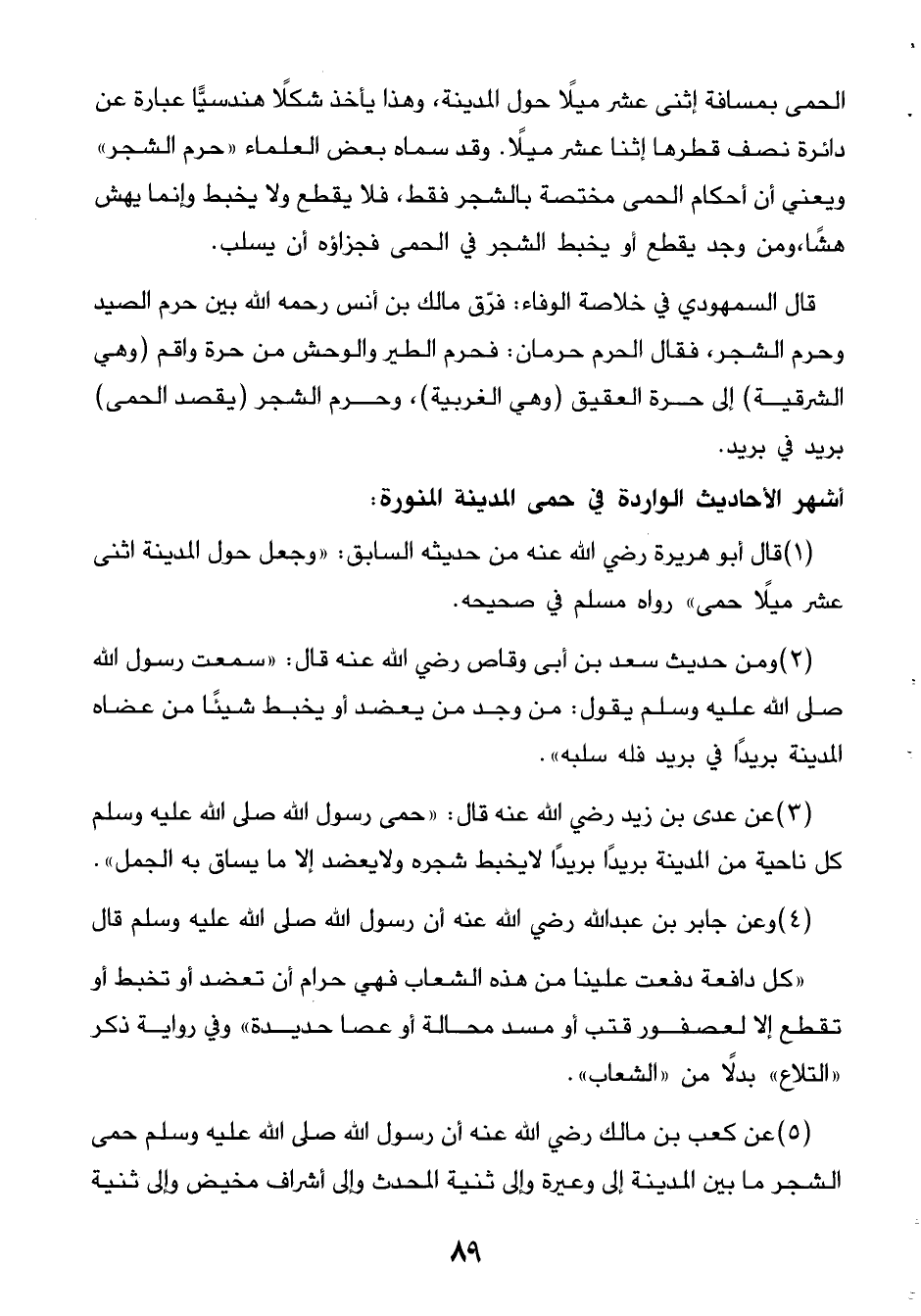 89…الحمى بمسافة اثني عشر ميًلا حول المدينة، وهذا يأخذ شكًلا هندسيًا عبارة عن دائرة نصف قطرها إثنا عشر ميًلا. وقد سماه بعض العلماء ((حرم الشجر)) ويعني أن أحكام الحمى مختصة بالشجر فقط، فلا يقطع ولا يخبط وإنما يهش هشًا، ومن وجد يقطع أو يخبط الشجر في الحمى فجزاؤه أن يسلب. قال السمهودي في خلاصة الوفاء: فرّق مالك بن انس رحمه الله بين حرم الصيد وحرم الشجر، فقال الحرم حرمان: فحرم الطير والوحش من حرة واقم (وهي الشرقية) إلى حرة العقيق (وهي الغربية)، وحرم الشجر (يقصد الحمى) بريد في بريد.