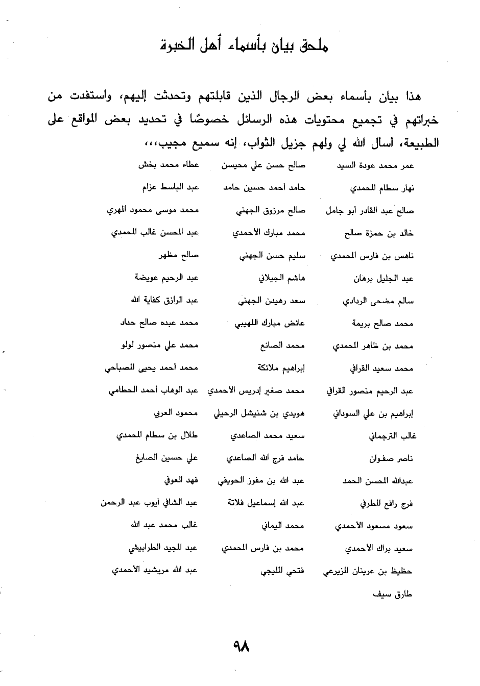 هذا بيان بأسماء بعض الرجال الذين قابلتهم وتحدثت إليهم، واستفدت من خبراتهم في تجميع محتويات هذه الرسائل خصوصًا في تحديد بعض المواقع على الطبيعة، أسأل الله لي ولهم جزيل الثواب، إنه سميع مجيب،،،