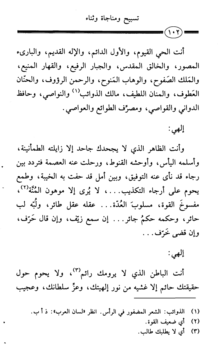 أنت الحي القيوم، والأول الدائم، والإله القديم، والبارئ المصور، والخالق المقدس، والجبار الرفيع، والقهار المنيع، والملَك الصَفوح، والوهاب المَنوح، والرحمن الرؤوف، والحنّان العَطوف، والمنان اللطيف، مالك الذوائب (¬1). والنواصي، وحافظ الدواني والقواصي، ومصرِّف الطوائع والعواصي.