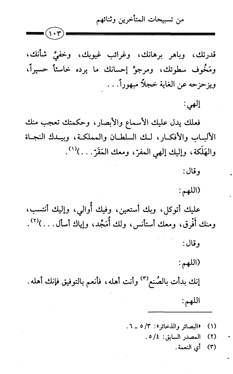 إلهي: فعلك يدل عليك الأسماع والأبصار، وحكمتك تعجب منك الألباب والأفكار، لك السلطان والمملكة، وبيدك النجاة والهَلَكة، وإليك إلهي المفرّ، ومعك المَقَرّ ... ) (¬1).