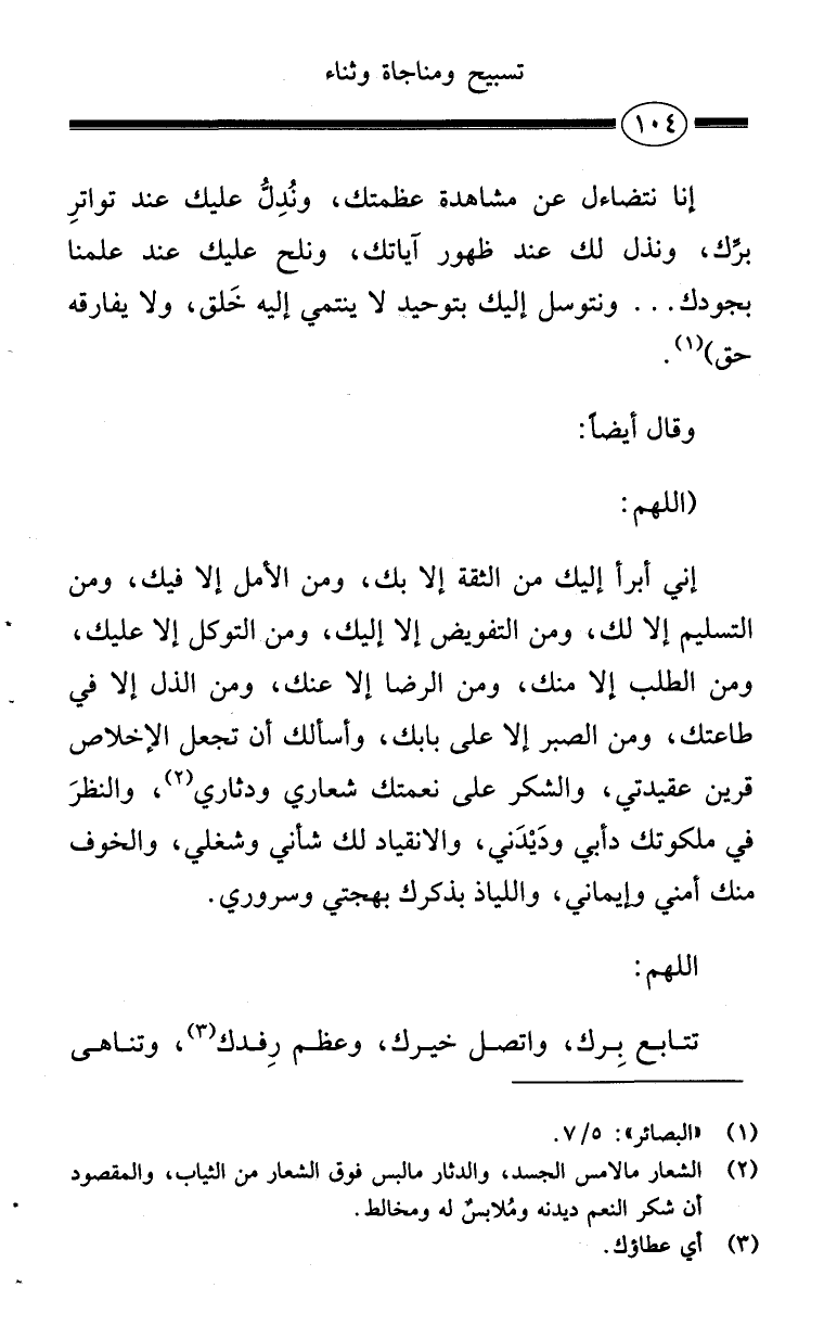إنا نتضاءل عن مشاهدة عظمتك، ونُدِلُّ عليك عند تواترِ برِّك، ونذل لك عند ظهور آياتك، ونلح عليك عند علمنا بجودك ... ونتوسل إليك بتوحيد لا ينتمي إليه خَلق، ولا يفارقه حق) (¬1).