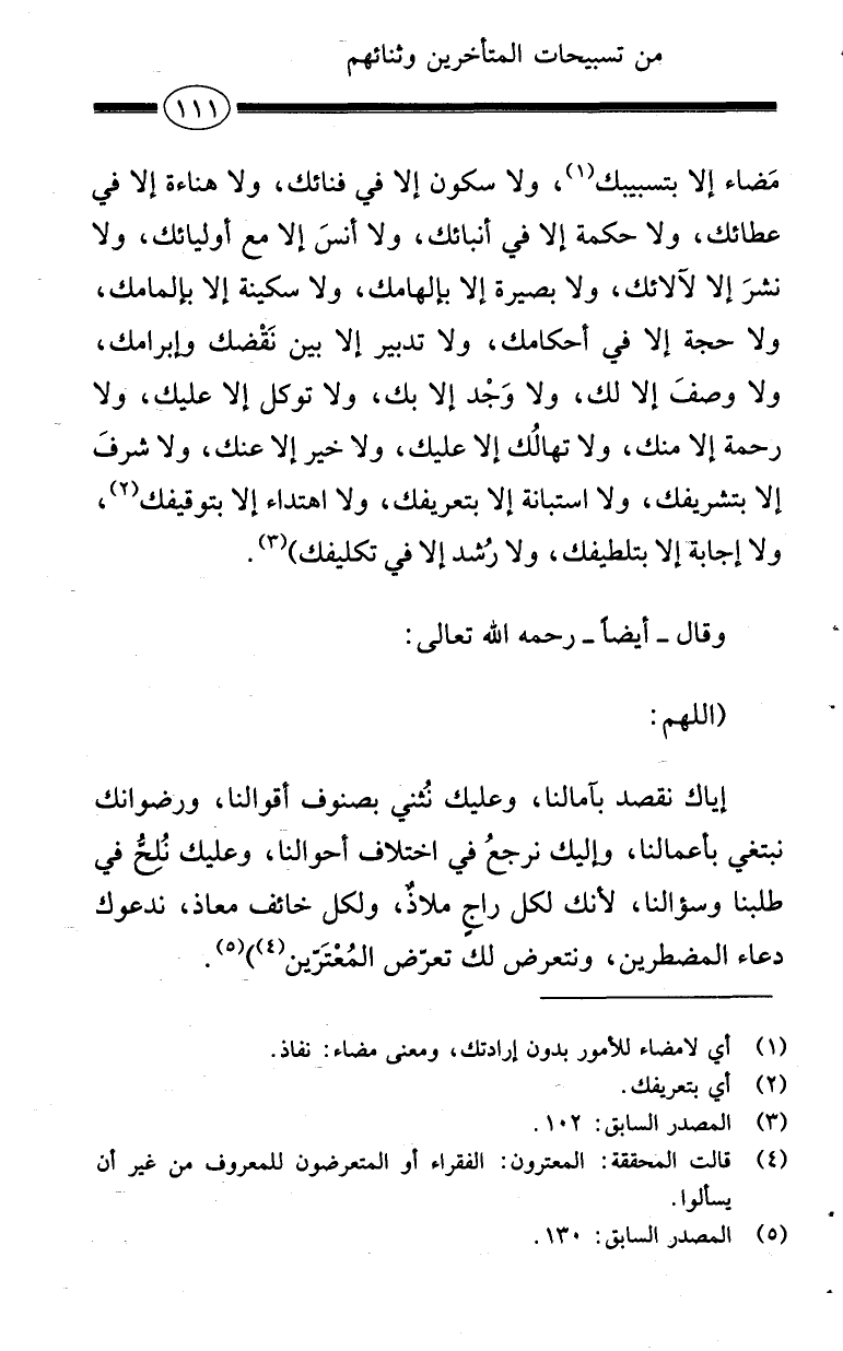 مَضاء إلا بتسبيبك (¬1)، ولا سكون إلا في فنائك، ولا هناءة إلا في عطائك، ولا حكمة إلا في أنبائك، ولا أنسَ إلا مع أوليائك، ولا نشرَ إلا لآلائك، ولا بصيرة إلا بإلهامك، ولا سكينة إلا بإلمامك، ولا حجة إلا في أحكامك، ولا تدبير إلا بين نَقْضك وإبرامك، ولا وصفَ إلا لك، ولا وَجْد إلا بك، ولا توكل إلا عليك، ولا رحمة إلا منك، ولا تهالُك إلا عليك، ولا خير إلا عنك، ولا شرفَ إلا بتشريفك، ولا استبانة إلا بتعريفك، ولا اهتداء إلا بتوقيفك (¬2)، ولا إجابة إلا بتلطيفك، ولا رُشد إلا في تكليفك) (¬3).