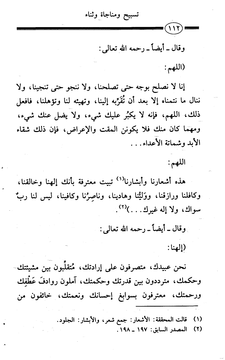 (إلهنا: نحن عبيدك، متصرفون على إرادتك، مُتقلِّبون بين مشيئتك وحكمك، مترددون بين قدرتك وحكمتك، آملون روادفَ عَطْفِك ورحمتك، معترفون بسوابغ إحسانك ونعمتك، خائفون من
