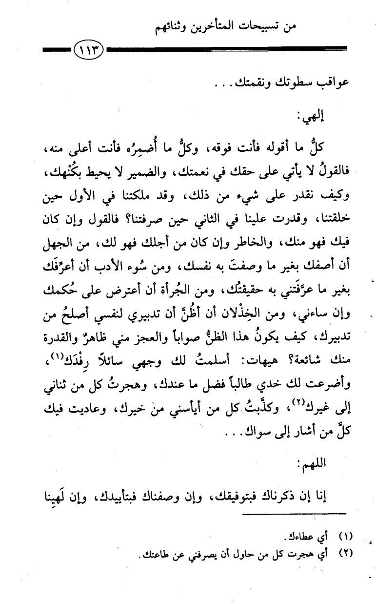 كلُّ ما أقوله فأنت فوقه، وكلُّ ما أُضمِرُه فأنت أعلى منه، فالقولُ لا يأتي على حقك في نعمتك، والضمير لا يحيط بكُنْهك، وكيف نقدر على شيء من ذلك، وقد ملكتنا في الأول حين خلقتنا، وقدرت علينا في الثاني حين صرفتنا؟ فالقول وإن كان فيك فهو منك، والخاطر وإن كان من أجلك فهو لك، من الجهل أن أصفك بغير ما وصفتَ به نفسك، ومن سُوء الأدب أن أعرِّفَك بغير ما عرَّفَتني به حقيقتُك، ومن الجُرأة أن أعترض على حُكمك وإن ساءني، ومن الخِذْلان أن أظُنَّ أن تدبيري لنفسي أصلحُ من تدبيرك، كيف يكونُ الظنُّ صواباً والعجز مني ظاهرٌ والقدرة منك شائعة؟ هيهات: أسلمتُ لك وجهي سائلاً رِفْدَك (¬1)، وأضرعت لك خدي طالباً فضل ما عندك، وهجرتُ كل من ثناني إلى غيركُ (¬2)، وكذَّبتُ كل من أيأسني من خيرك، وعاديت فيك كلَّ من أشار إلى سواك ...