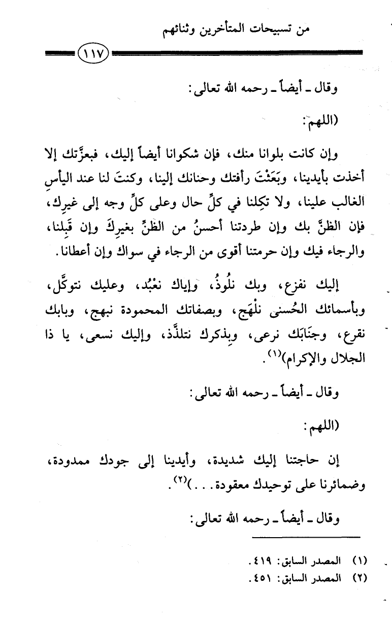 إليك نفزع، وبك نُلوذُ، وإياك نعْبُد، وعليك نتوكَّل، وبأسمائك الحُسنى نلْهَج، وبصفاتك المحمودة نبهج، وبابك نقرع، وجنَابَك نرعى، وبِذكرك نتلذَّذ وإليك نسعى، يا ذا الجلال والإكرام) (¬1).