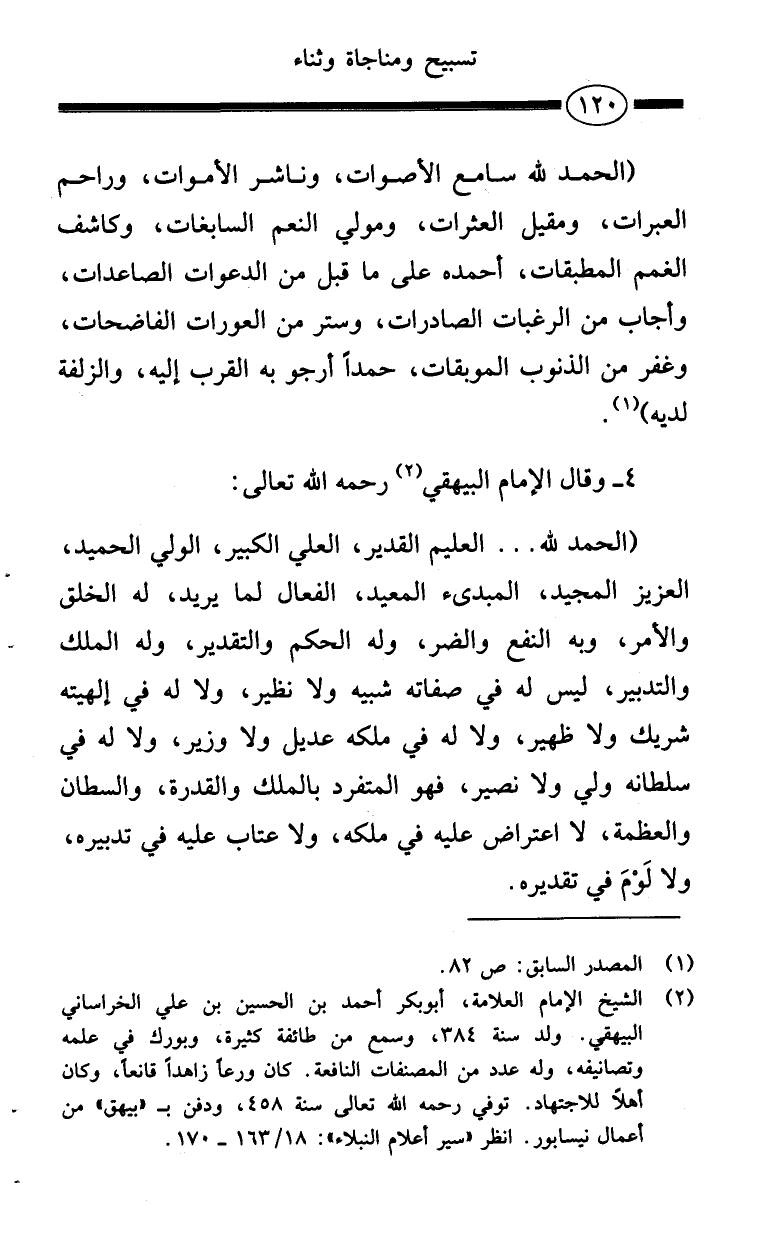 (الحمد لله ... العليم القدير، العلي الكبير، الولي الحميد، العزيز المجيد، المبدئ المعيد، الفعال لما يريد، له الخلق والأمر، وبه النفع والضر، وله الحكم والتقدير، وله الملك والتدبير، ليس له في صفاته شبيه ولا نظير، ولا له في إلهيته شريك ولا ظهير، ولا له في ملكه عديل ولا وزير، ولا له في سلطانه ولي ولا نصير، فهو المتفرد بالملك والقدرة، والسطان والعظمة، لا اعتراض عليه في ملكه، ولا عتاب عليه في تدبيره، ولا لَوْمَ في تقديره.