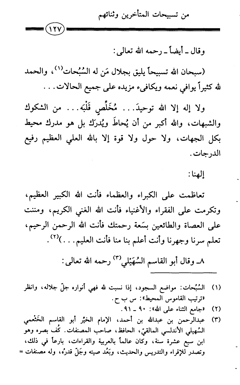 تعاظمت على الكبراء والعظماء فأنت الله الكبير العظيم، وتكرمت على الفقراء والأغنياء فأنت الله الغني الكريم، ومننت على العصاة والطائعين بسَعة رحمتك فأنت الله الرحمن الرحيم، تعلم سرنا وجهرنا وأنت أعلم بنا منا فأنت العليم ... ) (¬2).