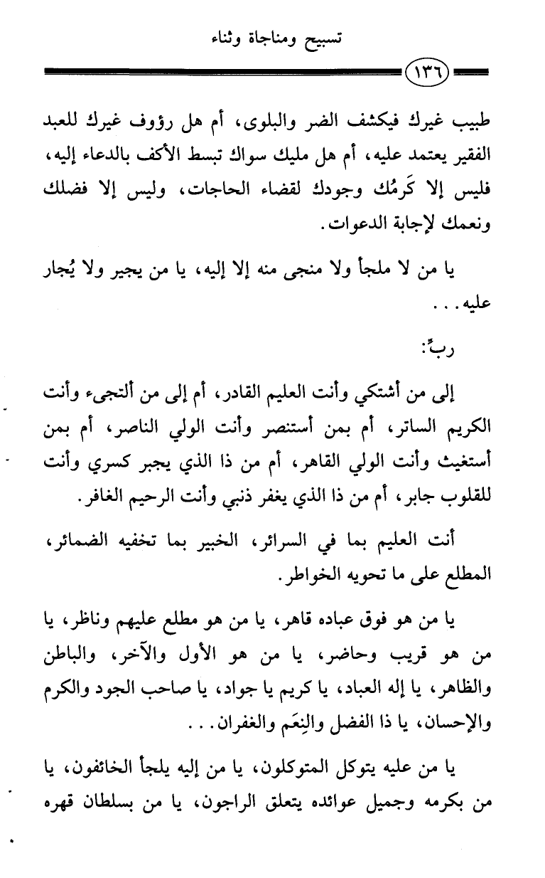 إلى من أشتكي وأنت العليم القادر، أم إلى من ألتجئ وأنت الكريم الساتر، أم بمن أستنصر وأنت الولي الناصر، أم بمن أستغيث وأنت الولي القاهر، أم من ذا الذي يجبر كسري وأنت للقلوب جابر، أم من ذا الذي يغفر ذنبي وأنت الرحيم الغافر.