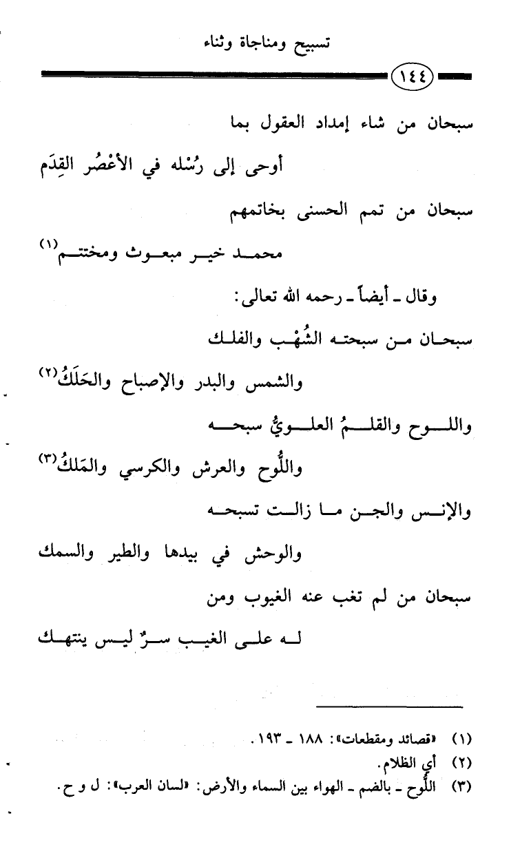 سبحان من سبحته الشُهْب والفلك ... ج والشمس والبدر والإصباح والحَلَكُ (¬2)