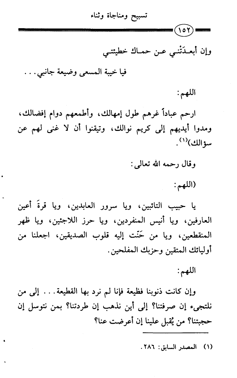 يا حبيب التائبين، ويا سرور العابدين، ويا قرةَ أعين العارفين، ويا أنيس المنفردين، ويا حرز اللاجئين، ويا ظهر المنقطعين، ويا من حَنّت إليه قلوب الصديقين، اجعلنا من أوليائك المتقين وحزبك المفلحين.