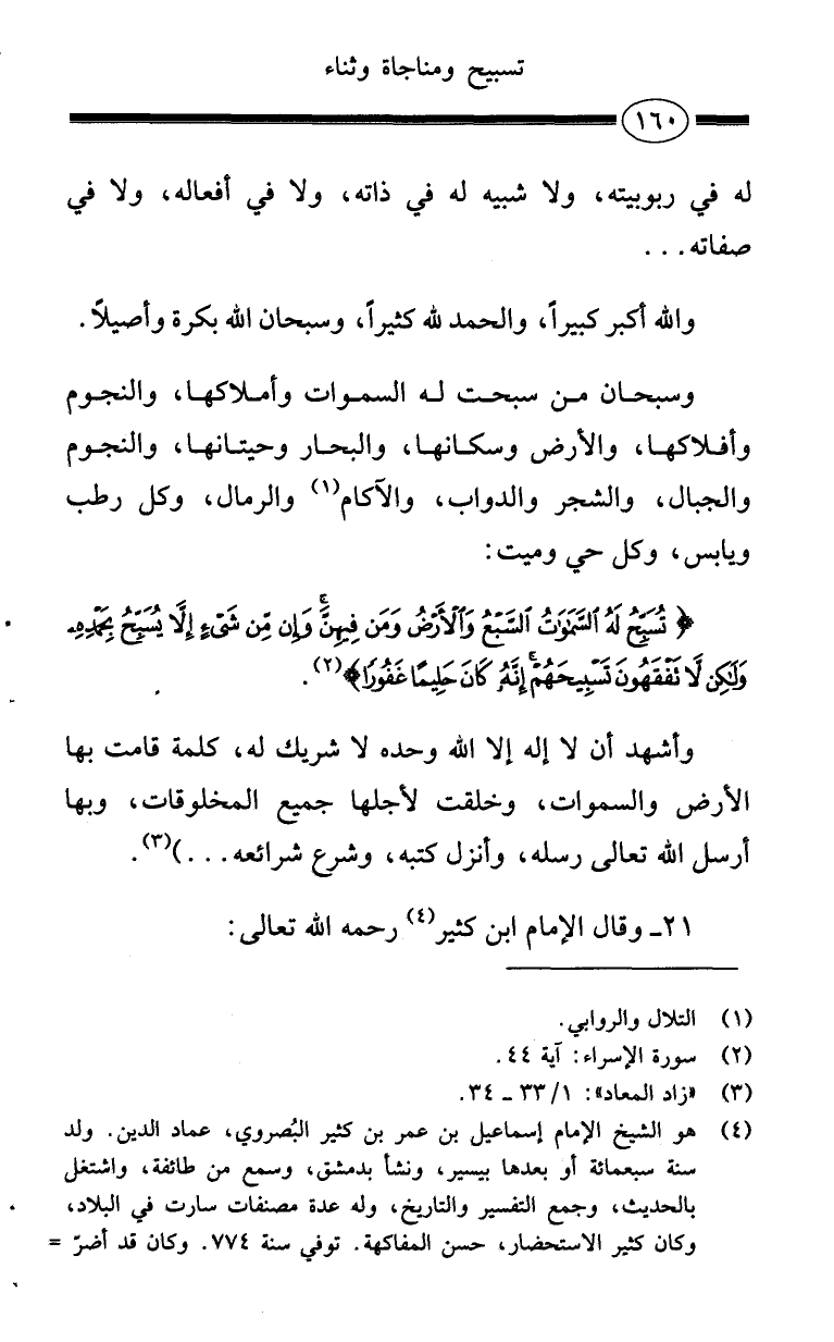 {تُسَبِّحُ لَهُ السَّمَاوَاتُ السَّبْعُ وَالأَرْضُ وَمَن فِيهِنَّ وَإِن من شَيْءٍ إِلاَّ يُسَبِّحُ بِحَمْدِهِ وَلَكِن لاَّ تَفْقَهُونَ تَسْبِيحَهُمْ إِنَّهُ كَانَ حَلِيمًا غَفُورًا (¬2)}.
