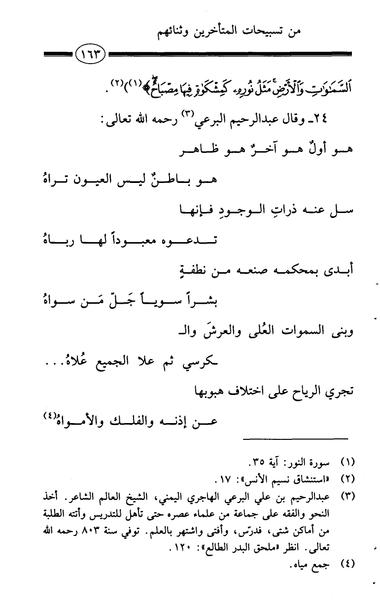 (¬3) عبد الرحيم بن علي البرعي الهاجري اليمني، الشيخ العالم الشاعر. أخذ النحو والفقه على جماعة من علماء عصره حتى تأهل للتدريس وأتته الطلبة من أماكن شتى فدرّس، وأفتى واشتهر بالعلم توفي سنة 803 رحمه الله تعالى. انظر ((ملحق البدر الطالع)): 120.