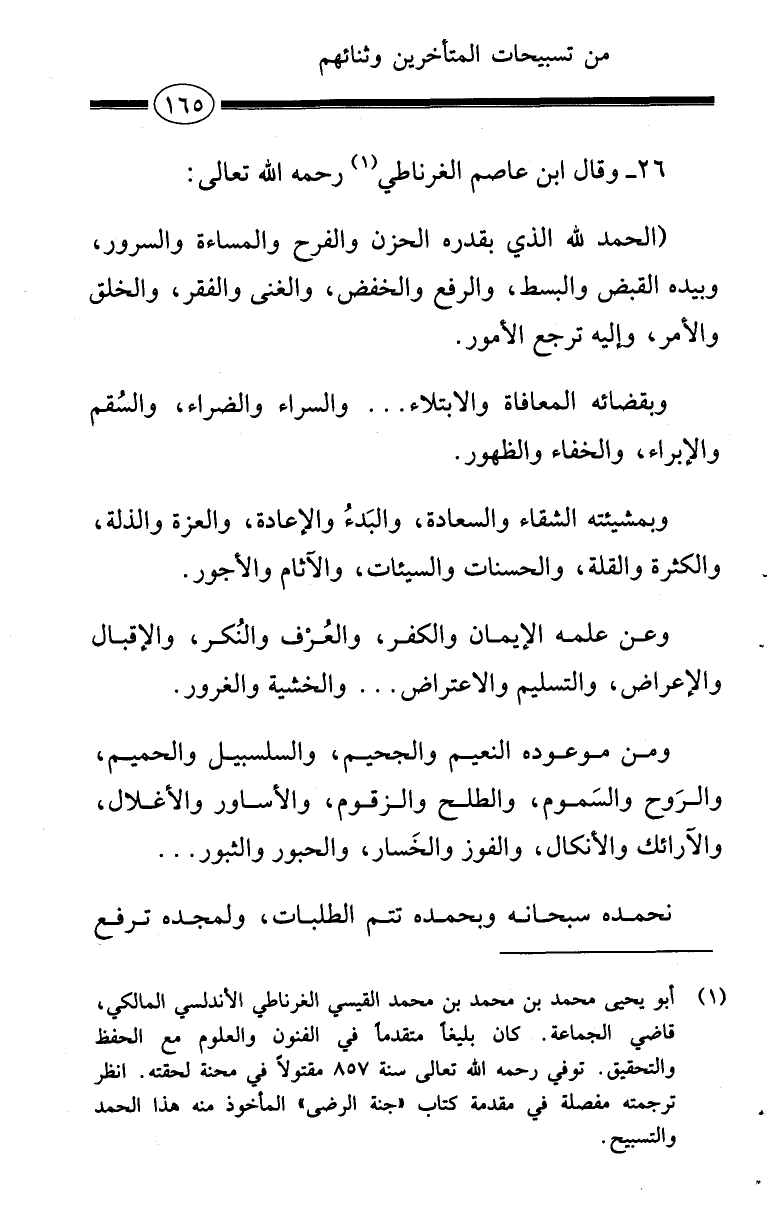 (¬1) أبو يحيى محمد بن محمد بن محمد القيسي الغرناطي الأندلسي المالكي، قاضي الجماعة. كان بليغاً متقدماً في الفنون والعلوم مع الحفظ والتحقيق. توفي رحمه الله تعالى سنة 857 مقتولاً في محنة لحقته. انظر ترجمته مفصلة في مقدمة كتاب ((جنة الرضى)) المأخوذ منه هذا الحمد والتسبيح.