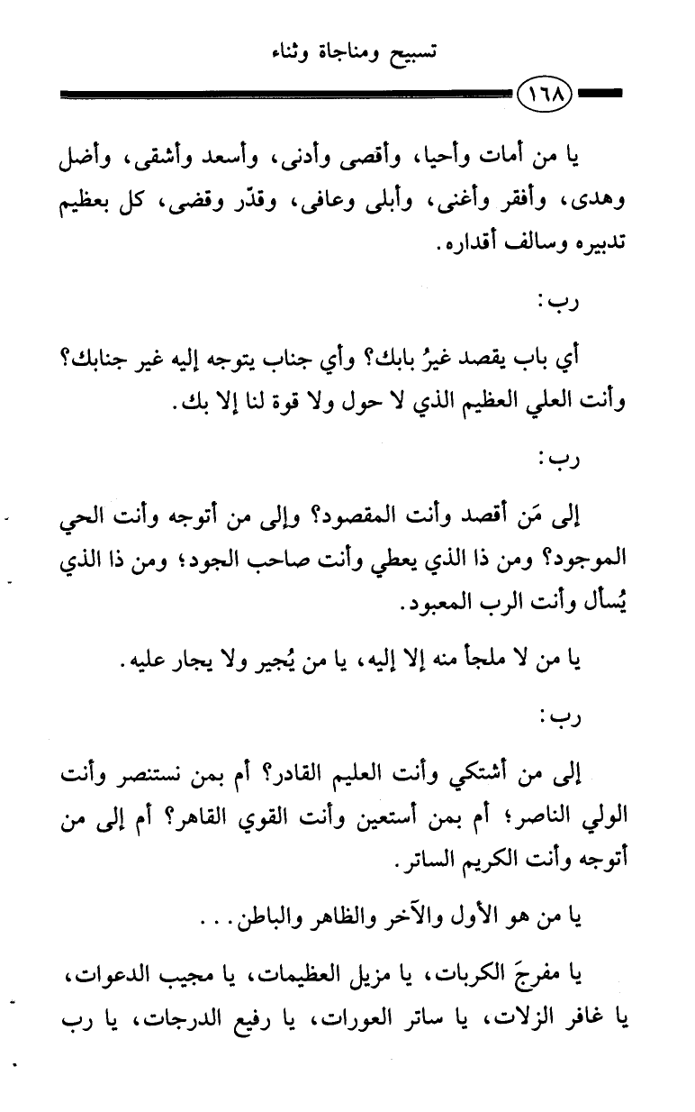 إلى مَن أقصد وأنت المقصود؟ وإلى من أتوجه وأنت الحي الموجود؟ ومن ذا الذي يعطي وأنت صاحب الجود؛ ومن ذا الذي يُسأل وأنت الرب المعبود.