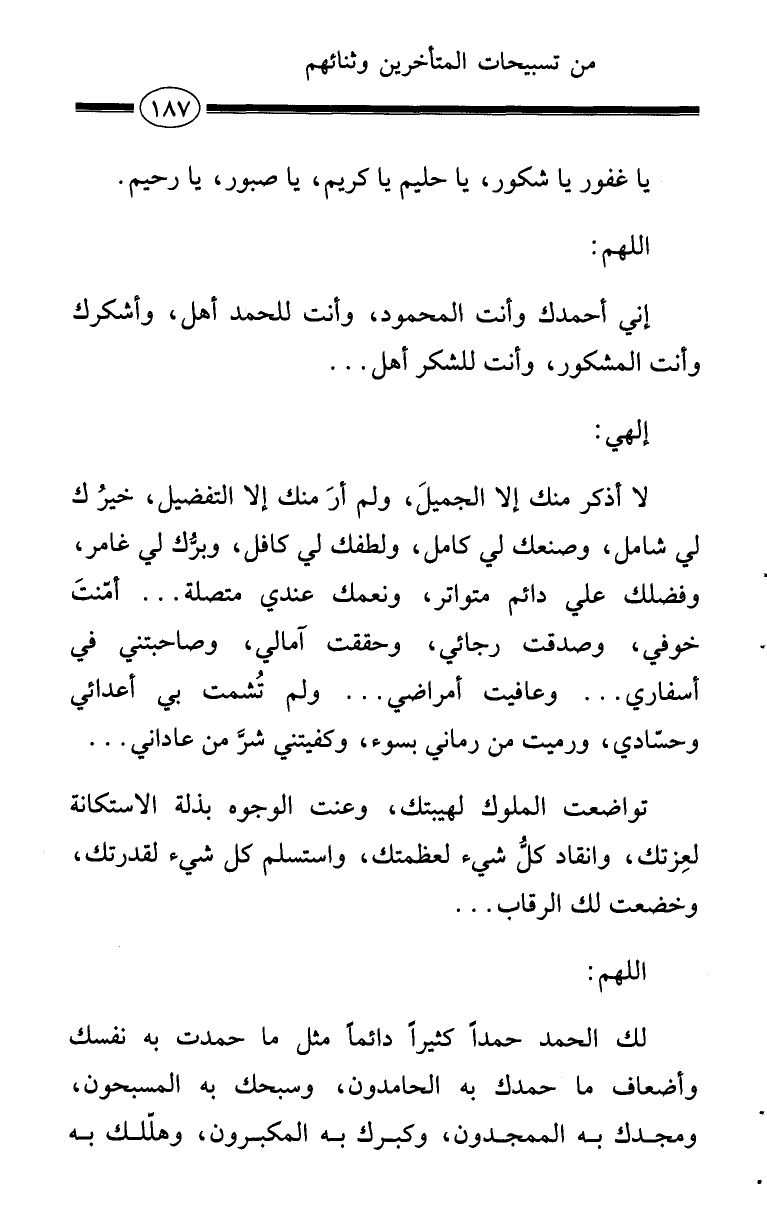 لا أذكر منك إلا الجميلَ، ولم أرَ منك إلا التفضيل، خيرُ ك لي شامل، وصنعك لي كامل، ولطفك لي كافل، وبرُّك لي غامر، وفضلك علي دائم متواتر، ونعمك عندي متصلة ... أمّنتَ خوفي، وصدقت رجائي، وحققت آمالي، وصاحبتني في أسفاري ... وعافيت أمراضي ... ولم تُشمت بي أعدائي وحسّادي، ورميت من رماني بسوء، وكفيتني شرَّ من عاداني ...