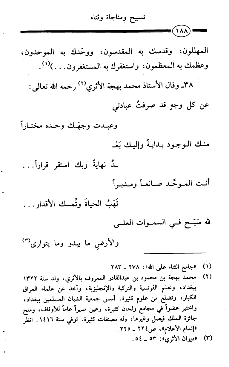 (¬2) محمد بهجة بن محمود بن عبد القادر المعروف بالأثري، ولد سنة 1322 ببغداد، وتعلم الفرنسية والتركية والإنجليزية، وأخذ عن علماء العراق الكبار، وتضلع من علوم كثيرة. أسس جمعية الشبان المسلمين ببغداد، واختير عضواً في مجامع ولجان كثيرة،= =وعين مديراً عاماً للأوقاف، ومنح جائزة الملك فيصل وغيرها، وله مصنفات كثيرة. توفي سنة 1416. انظر ((إتمام الأعلام))، ص 224 ـ 225.
