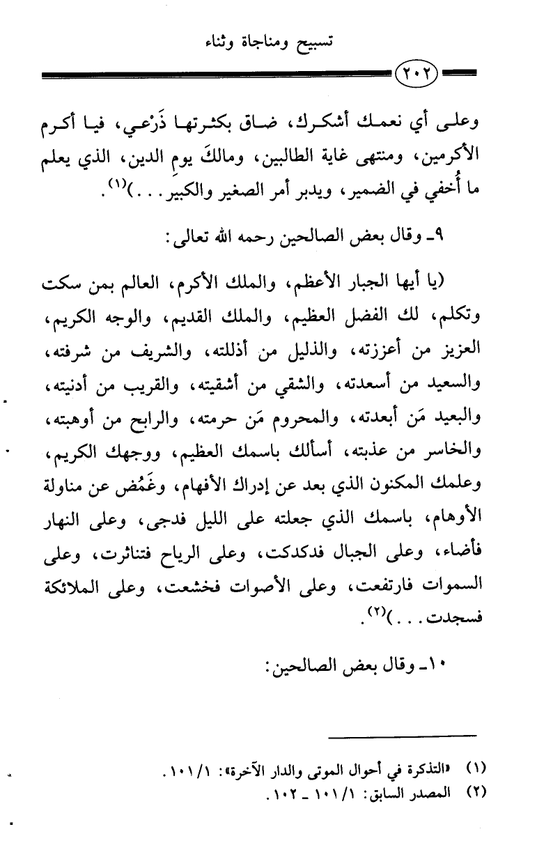 وعلى أي نعمك أشكرك، ضاق بكثرتها ذَرْعي، فيا أكرم الأكرمين، ومنتهي غاية الطالبين، ومالكَ يومِ الدين، الذي يعلم ما أُخفي في الضمير، ويدبر أمر الصغير والكبير ... ) (¬1).