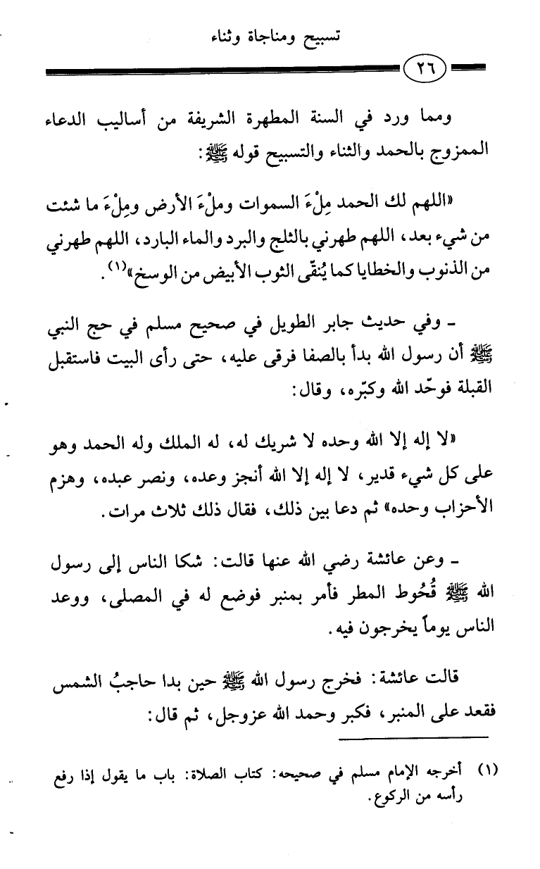 ((اللهم لك الحمد مِلْءَ السموات وملْءَ الأرض ومِلْءَ ما شئت من شيء بعد، اللهم طهرني بالثلج والبرد والماء البارد، اللهم طهرني من الذنوب والخطايا كما يُنقّى الثوب الأبيض من الوسخ)) (¬1).