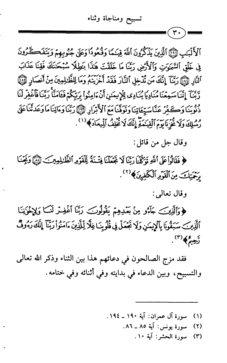 الألْبَابِ (190) الَّذِينَ يَذْكُرُونَ اللهَ قِيَامًا وَقُعُودًا وَعَلَى جُنُوبِهِمْ وَيَتَفَكَّرُونَ فِي خَلْقِ السَّمَاوَاتِ وَالأَرْضِ رَبَّنَا مَا خَلَقْتَ هَذَا بَاطِلاً سُبْحَانَكَ فَقِنَا عَذَابَ النَّارِ (191) رَبَّنَا إِنَّكَ مَن تُدْخِلِ النَّارَ فَقَدْ أَخْزَيْتَهُ وَمَا لِلظَّالِمِينَ مِنْ أَنْصَارٍ (192) رَبَّنَا إِنَّنَا سَمِعْنَا مُنَادِيًا يُنَادِى لِلإِيمَانِ أَنْ آمِنُوا بِرَبِّكُمْ فَآمَنَّا رَبَّنَا فَاغْفِرْ لَنَا ذُنُوبَنَا وَكَفِّرْ عَنَّا سيِّئَاتِنَا وَتَوَفَّنَا مَعَ الأبْرَارِ (193) رَبَّنَا وَآتِنَا مَا وَعَدتَّنَا عَلَى رُسُلِكَ وَلاَ تُخْزِنَا يَوْمَ الْقِيَامَةِ إِنَّكَ لاَ تُخْلِفُ الْمِيعَادَ} (¬1).