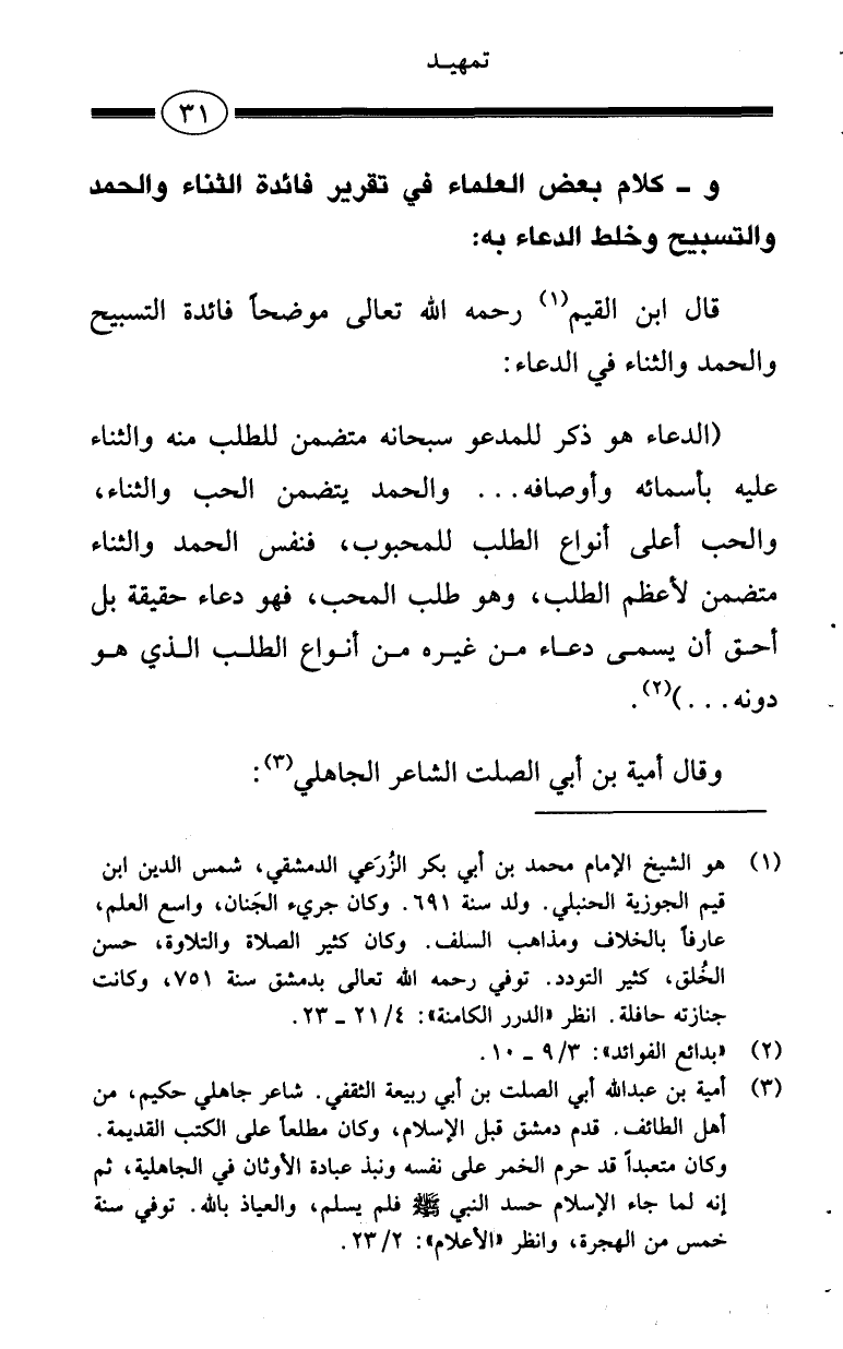 (¬1) هو الشيخ الإمام محمد بن أبي بكر الزُرَعي الدمشقي، شمس الدين ابن قيم الجوزية الحنبلي. ولد سنة 691. وكان جريء الجَنان، واسع العلم، عارفاً بالخلاف ومذاهب السلف. وكان كثير الصلاة والتلاوة، حسن الخُلق، كثير التودد. توفي رحمه الله تعالى بدمشق سنة 751، وكانت جنازته حافلة. انظر ((الدرر الكامنة)): 4/ 21 ـ 23.