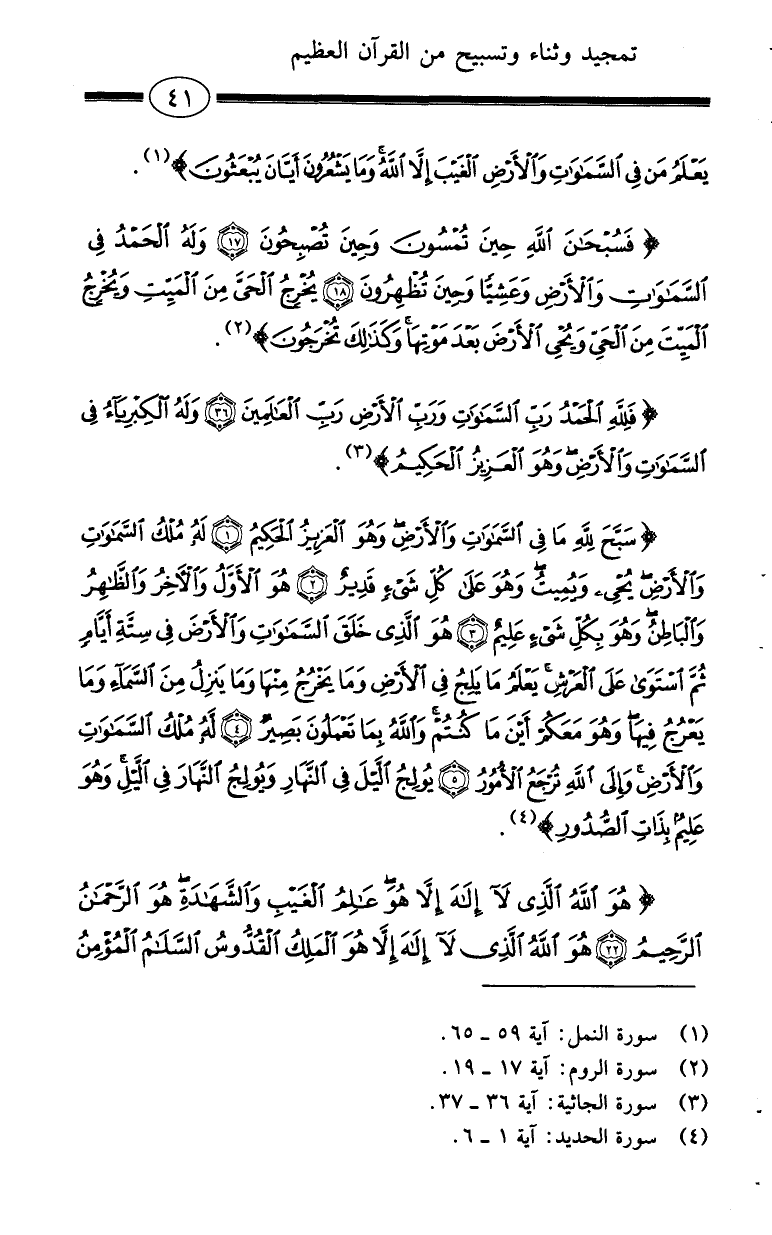 {سَبَّحَ للهِ مَا فِي السَّمَاوَاتِ وَالأَرْضِ وَهُوَ الْعَزِيزُ الْحَكِيمُ (1) لَهُ مُلْكُ السَّمَاوَاتِ وَالأَرْضِ يُحْيِي وَيُمِيتُ وَهُوَ عَلَى كُلِّ شَيْءٍ قَدِيرٌ (2) هُوَ الأوَّلُ وَالآَخِرُ وَالظَّاهِرُ وَالْبَاطِنُ وَهُوَ بِكُلِّ شَيْءٍ عَلِيمٌ (3) هُوَ الَّذِي خَلَقَ السَّمَاوَاتِ وَالأَرْضَ فِي سِتَّةِ أَيَّامٍ ثُمَّ اسْتَوَى عَلَى الْعَرْشِ يَعْلَمُ مَا يَلِجُ فِي الأَرْضِ وَمَا يَخْرُجُ مِنْهَا وَمَا يَنْزِلُ مِنَ السَّمَاءِ وَمَا يَعْرُجُ فِيهَا وَهُوَ مَعَكُمْ أَيْنَ مَا كُنْتُمْ وَاللهُ بِمَا تَعْمَلُونَ بَصِيرٌ (4) لَهُ مُلْكُ السَّمَاوَاتِ وَالأَرْضِ وَإِلَى اللهِ تُرْجَعُ الأُمُورُ (5) يُولِجُ اللَّيْلَ فِي النَّهَارِ وَيُولِجُ النَّهَارَ فِي اللَّيْلِ وَهُوَ عَلِيمٌ بِذَاتِ الصُّدُورِ (¬4)}.