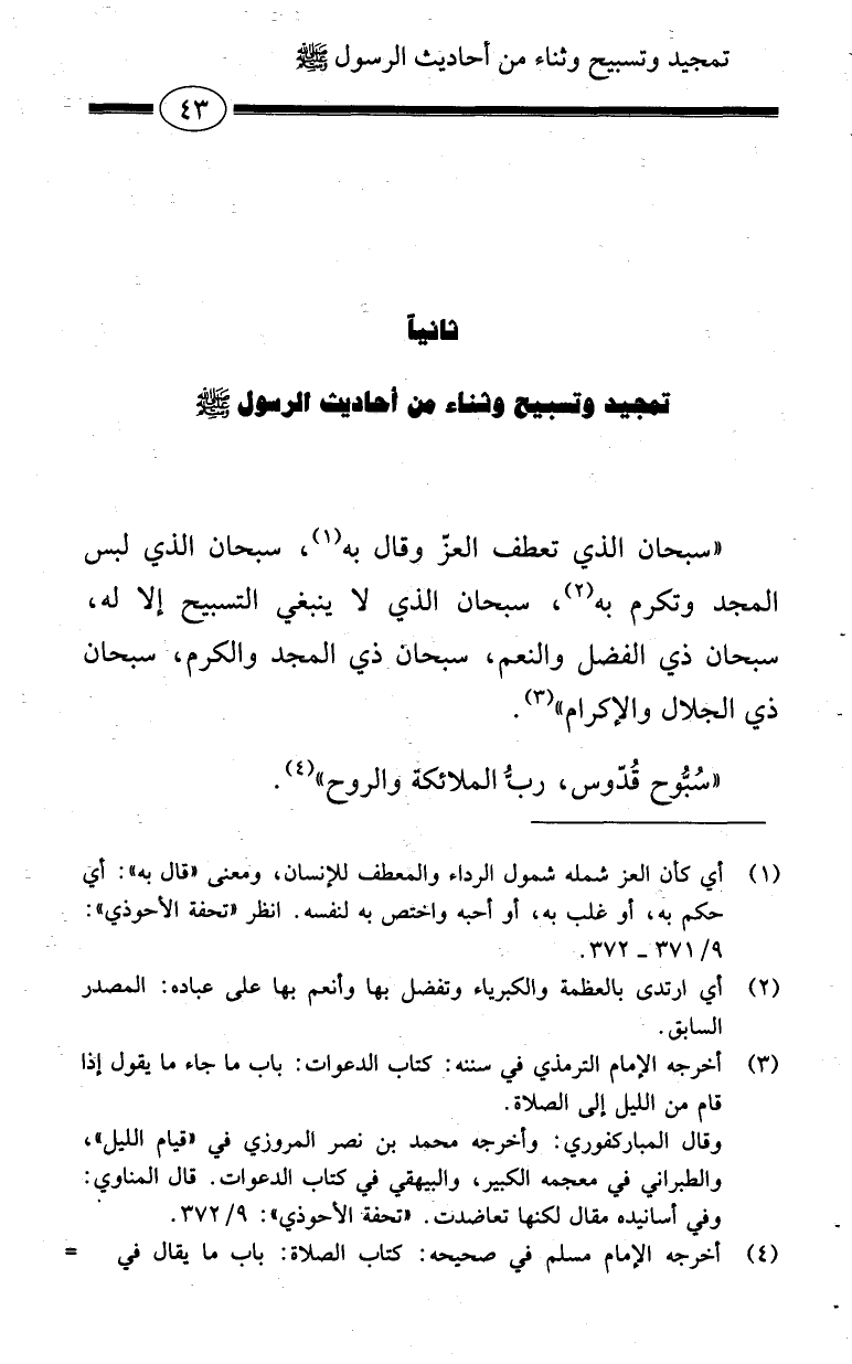 (¬4) أخرجه الإمام مسلم في صحيحه: كتاب الصلاة: باب مايقال في الركوع والسجود. وقال الإمام الخطابي: السُبُّوح: المنزه عن كل عيب، جاء بلفظ فُعُّول، من قولك: سبحت الله أي نزهته: ((شأن الدعاء)): 154.
