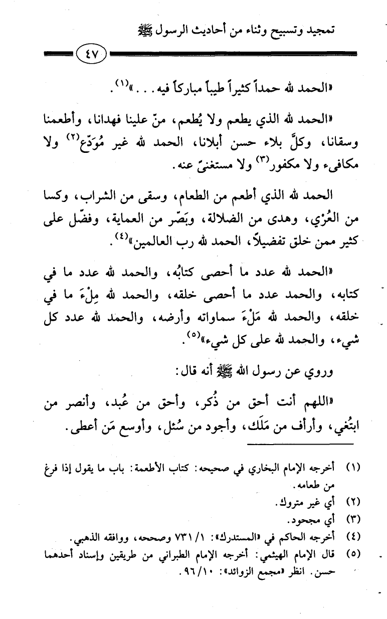 الحمد لله الذي أطعم من الطعام، وسقى من الشراب، وكسا من العُرْي، وهدى من الضلالة، وبَصّر من العماية، وفضّل على كثير ممن خلق تفضيلاً، الحمد لله رب العالمين)) (¬4).